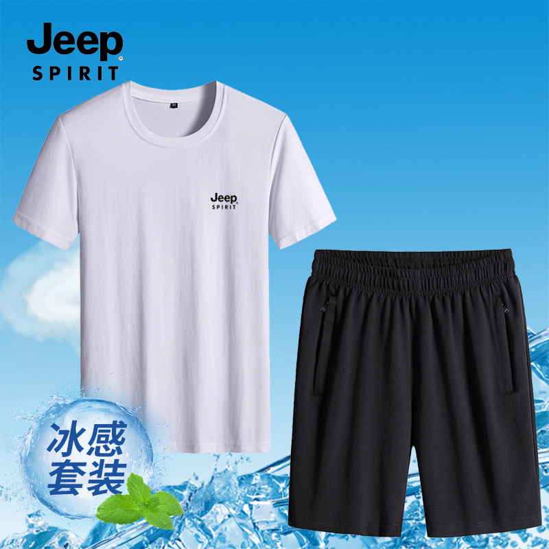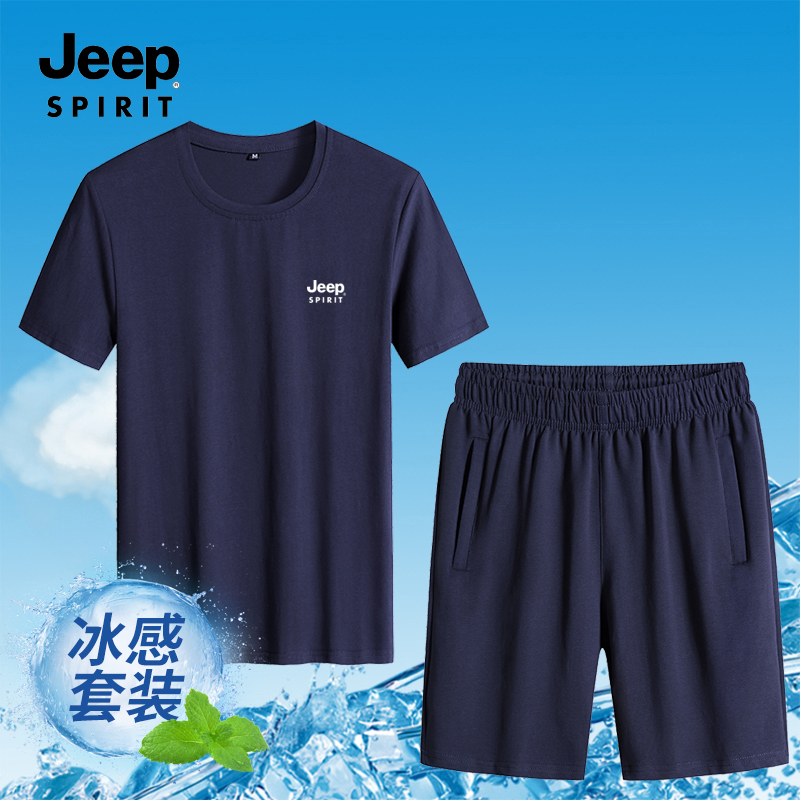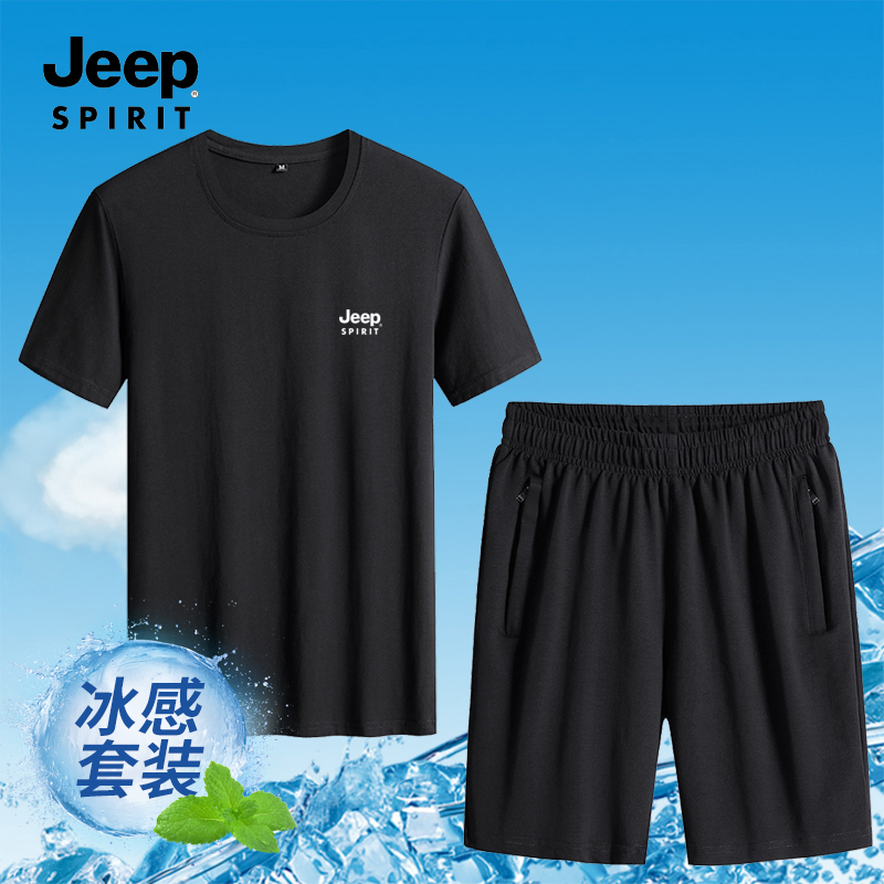 JEEP吉普夏季纯棉休闲套装男士圆领短袖T恤弹力五分裤宽松两件套