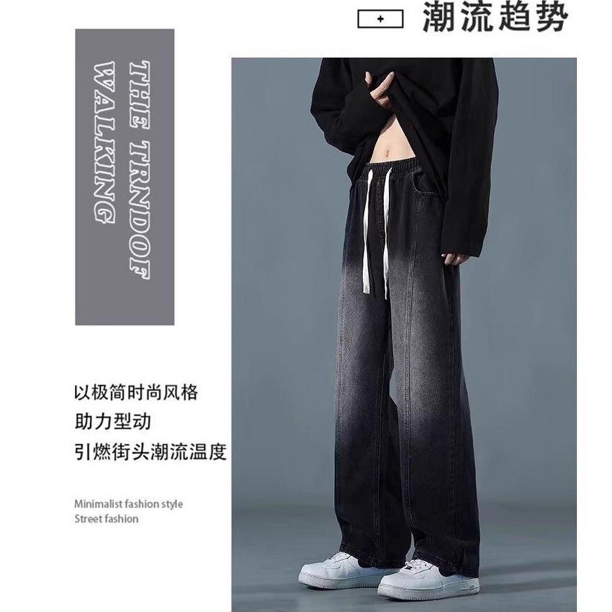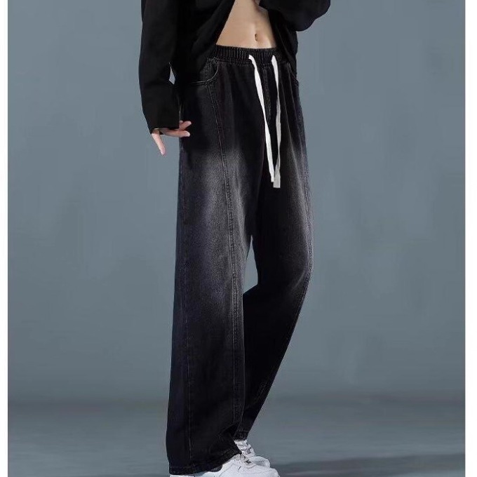 黑灰色松紧腰牛仔裤男款宽松直筒裤子2025年秋冬加绒休闲长裤男生