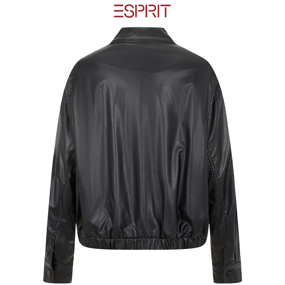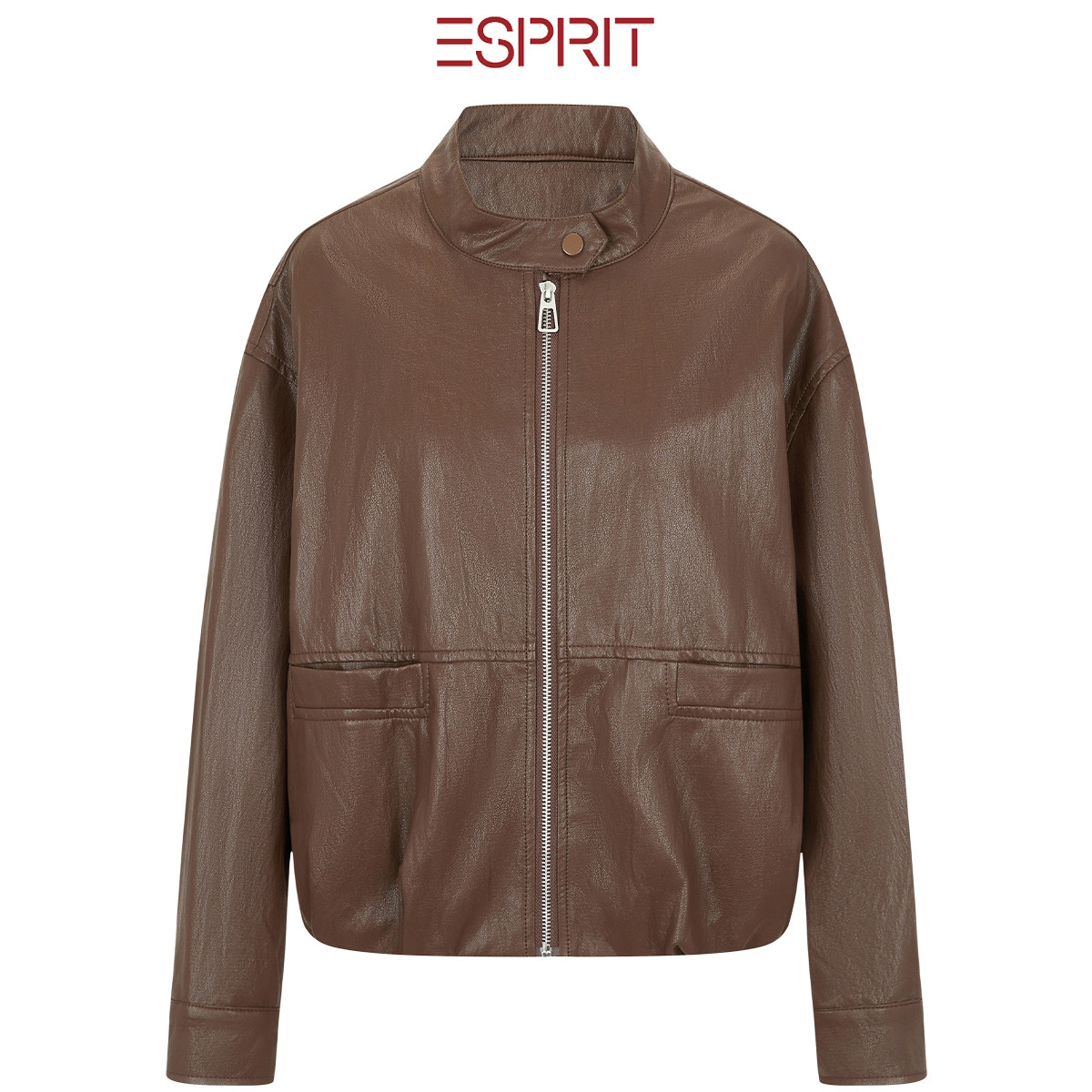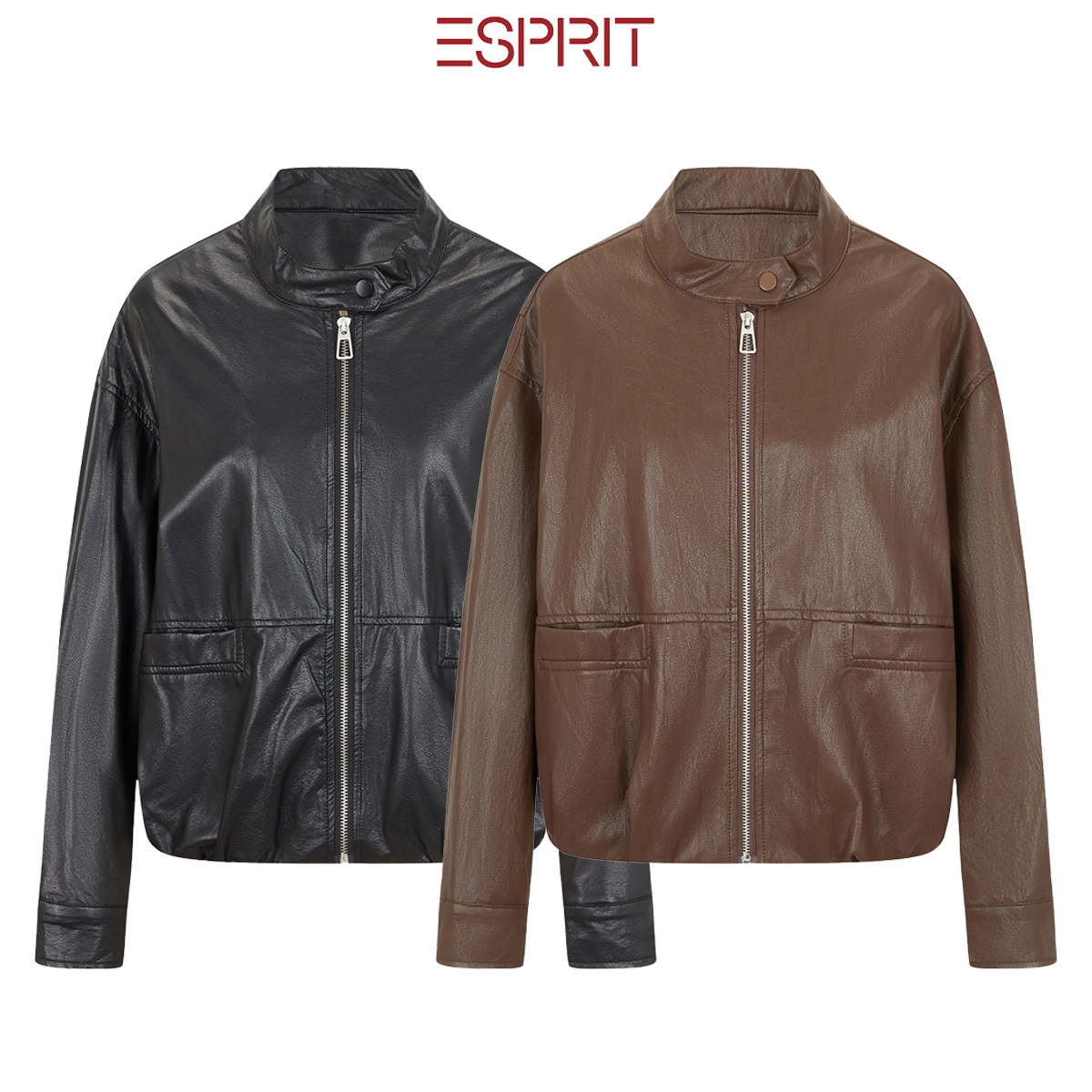 ESPRIT/埃斯普利特立领拉链短款皮衣女黑色机车风时髦皮夹克外套