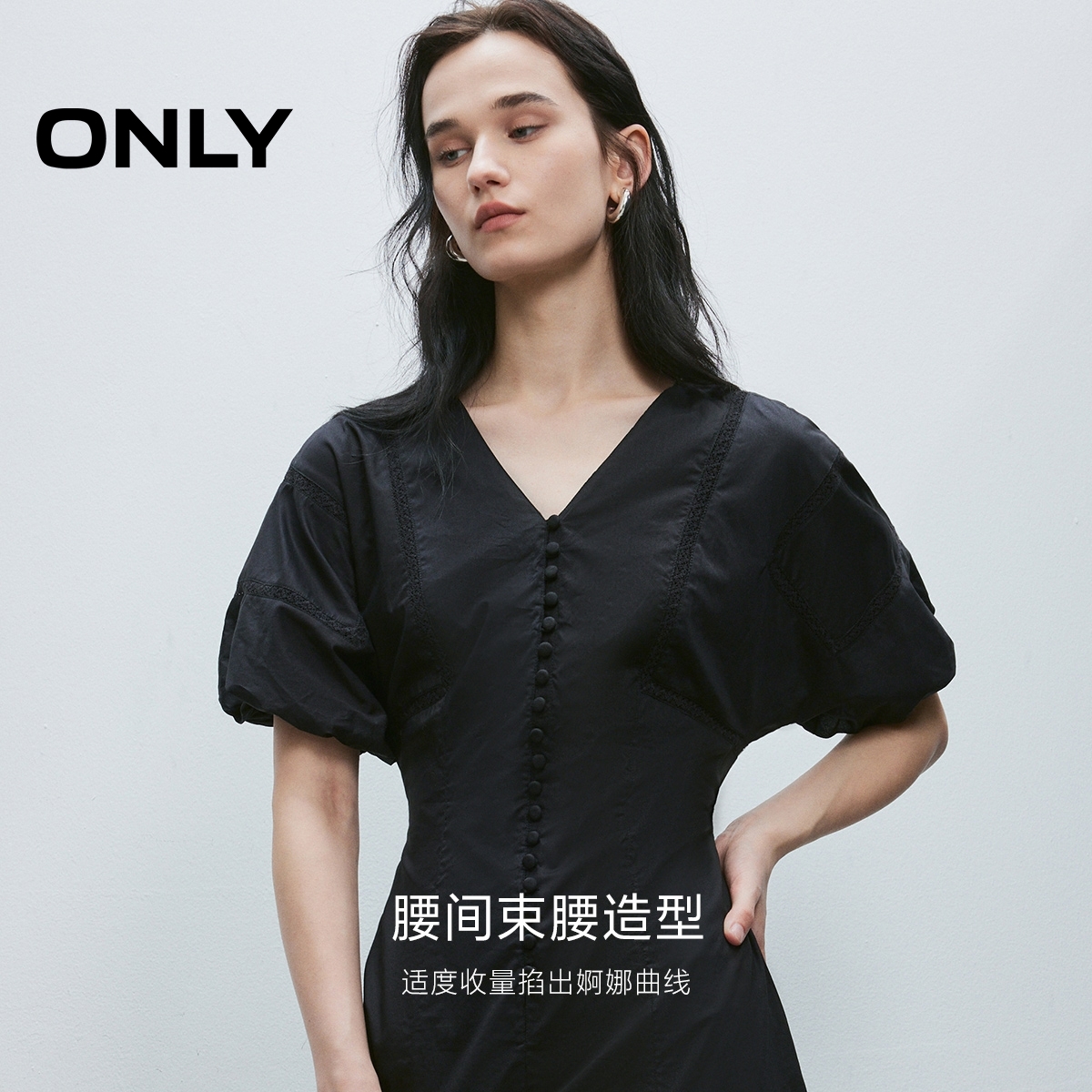ONLY2025夏季新款蕾丝拼接重工排扣V领花苞袖A字中长裙连衣裙女