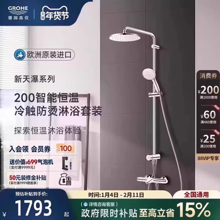 高仪原装进口新天瀑200恒温淋浴花洒套装冷触浴缸龙头超薄顶喷