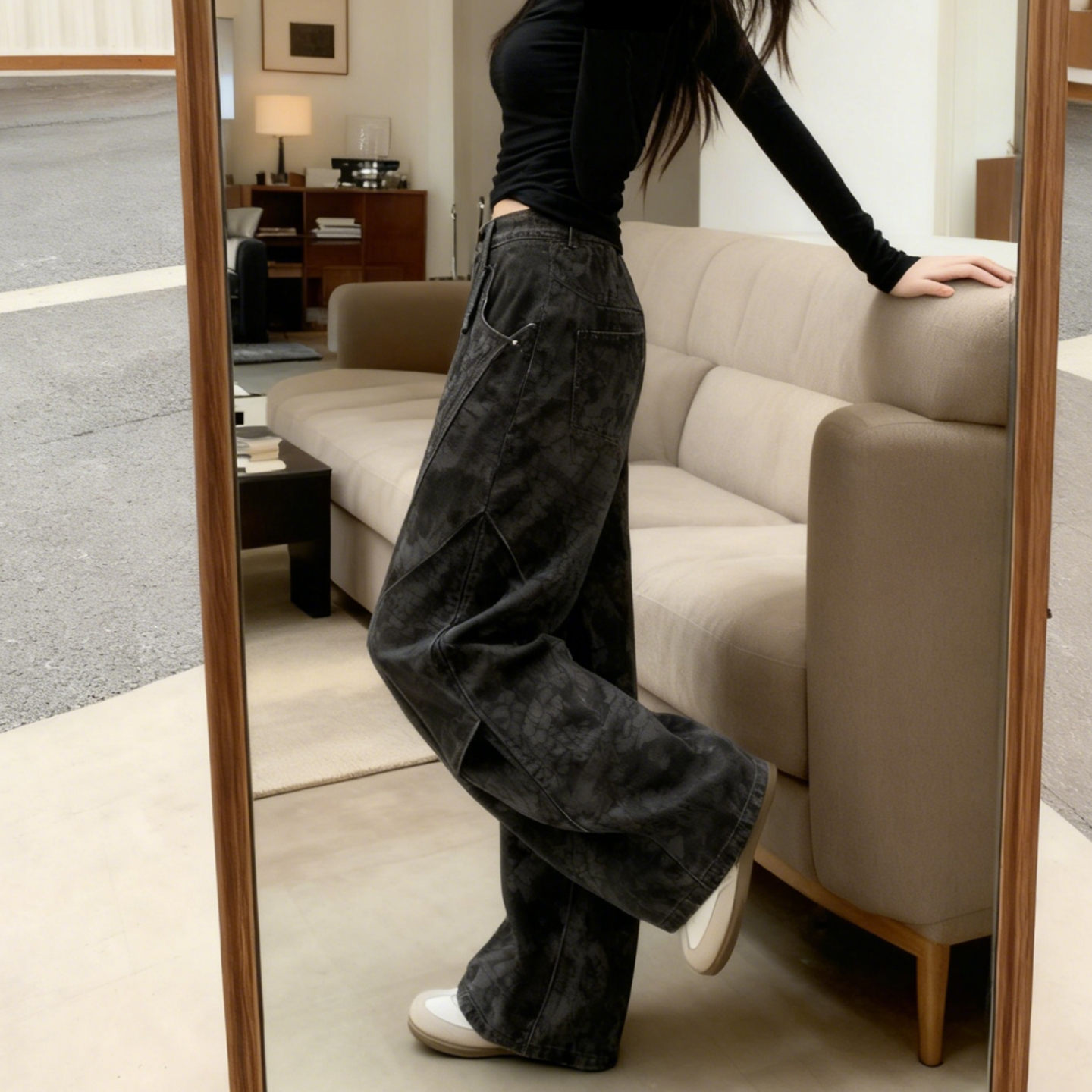 特大码女装胖mm复古黑色花纹阔腿牛仔裤女高腰宽松直筒工装长裤潮