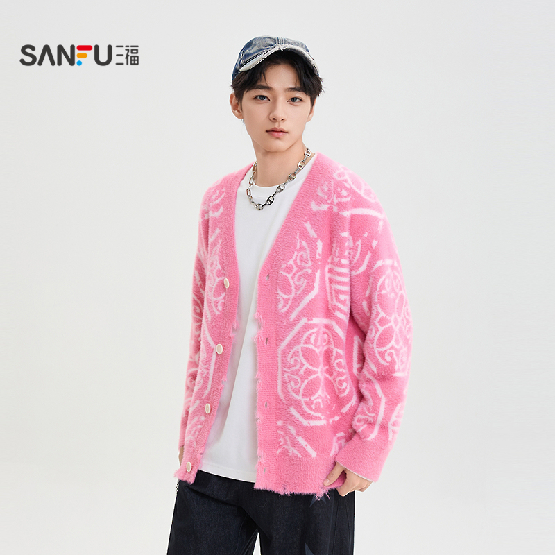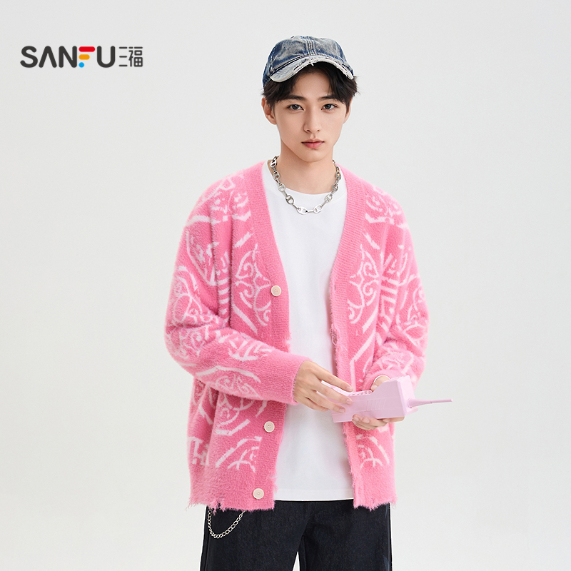 三福2025冬季男士祥纹设计廓形开衫毛衣 休闲微落上衣510035