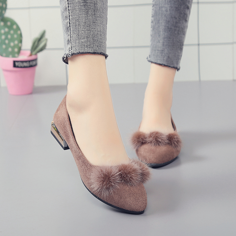 2025春秋平底毛毛尖头单鞋女浅口毛球可爱软底平跟豆豆鞋孕妇鞋子