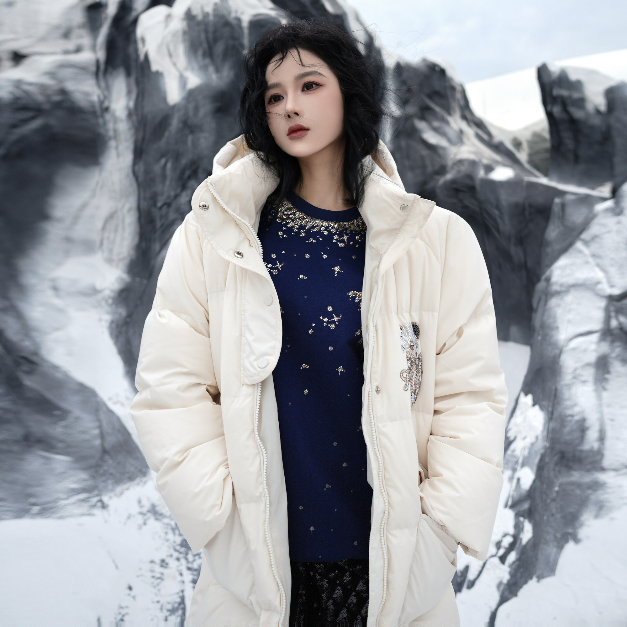 TCH轻奢烫钻加厚连帽长款羽绒服外套女潮2025冬季新款T75C19E9015