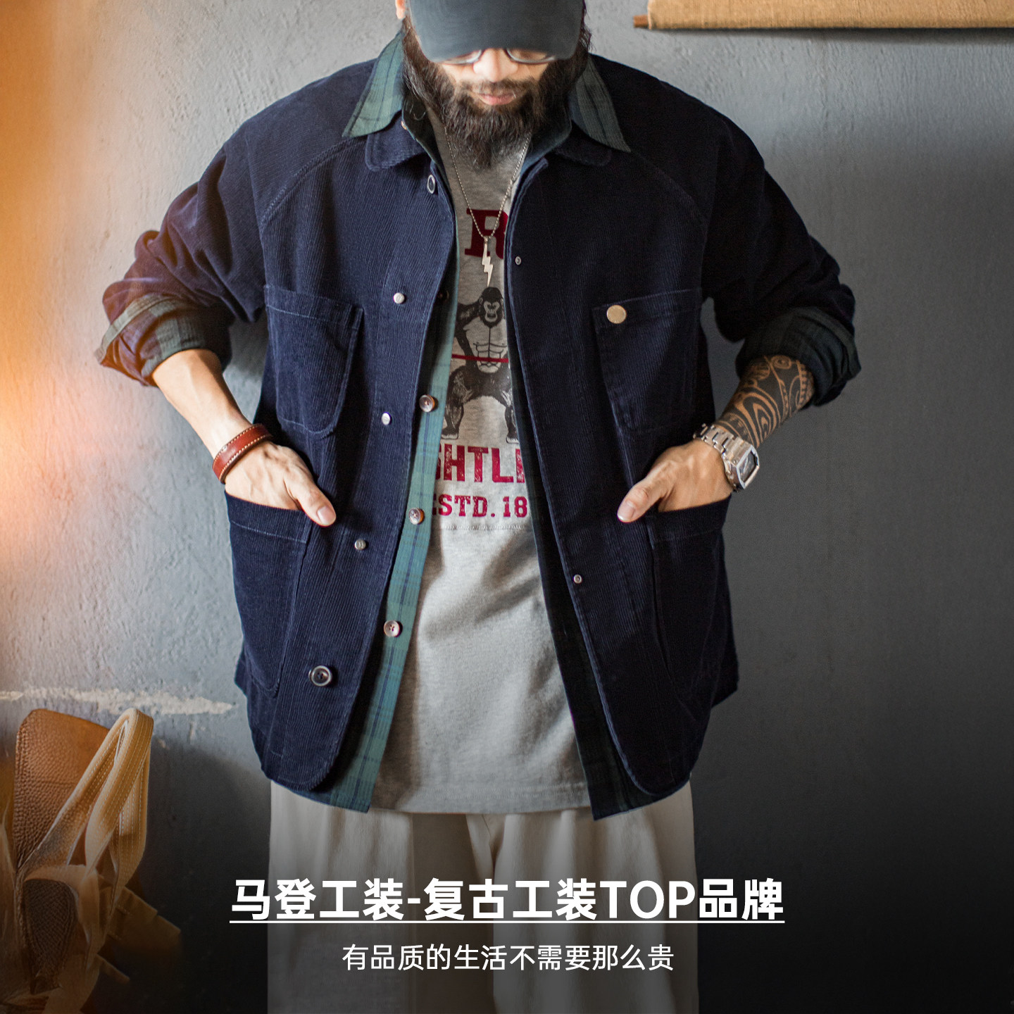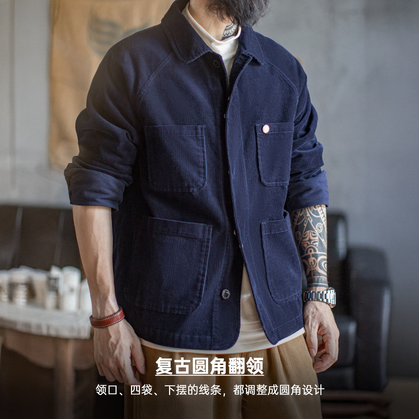 马登工装美式复古灯芯绒四袋猎装夹克短款藏蓝色翻领薄款外套男春