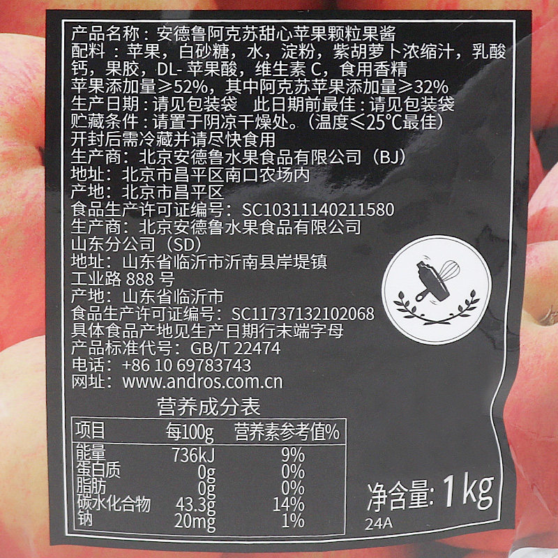 安德鲁阿克苏甜心苹果颗粒果酱1kg 气泡水慕斯甜品夹心果酱商用