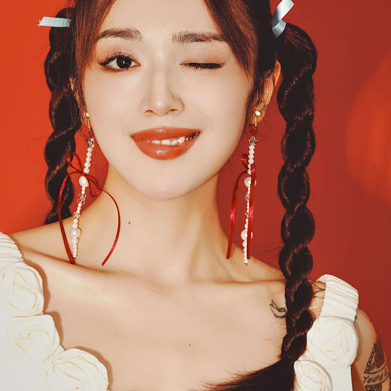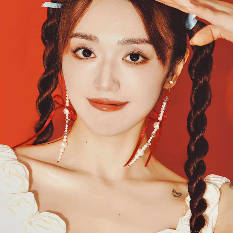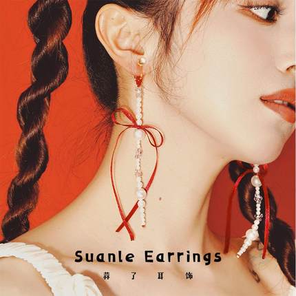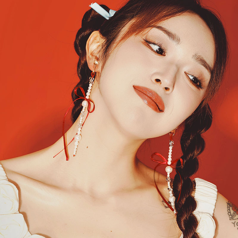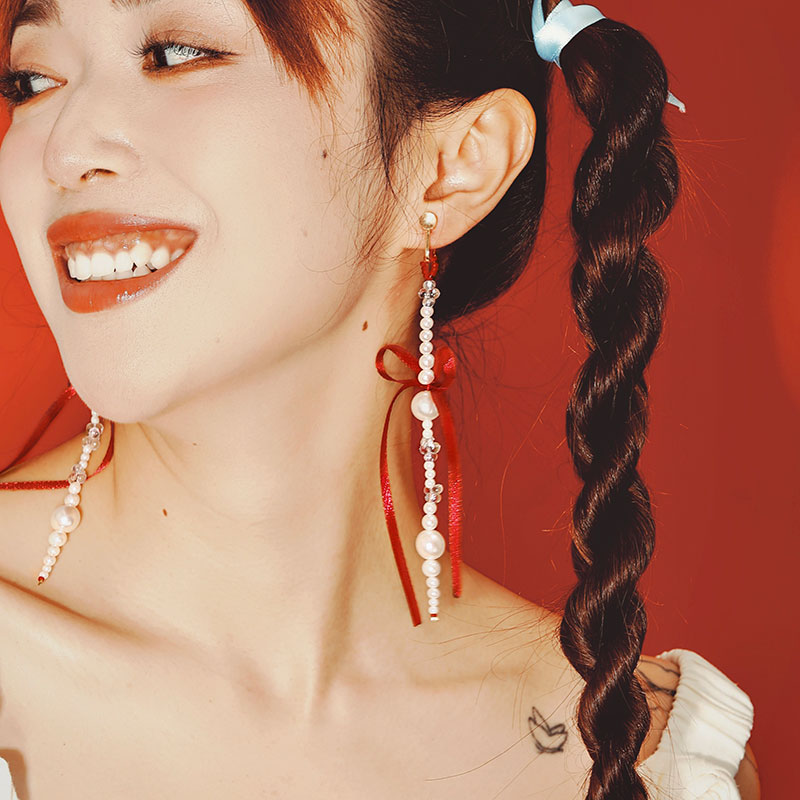 蒜了耳饰红色丝带夸张耳环气质珍珠圣诞耳钉秋冬长款新年耳夹少女