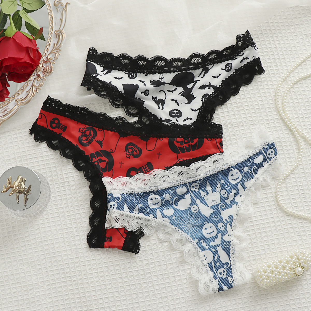 性感蕾丝拼接万圣节印花圣诞无痕冰丝T裤透气少女丁字裤