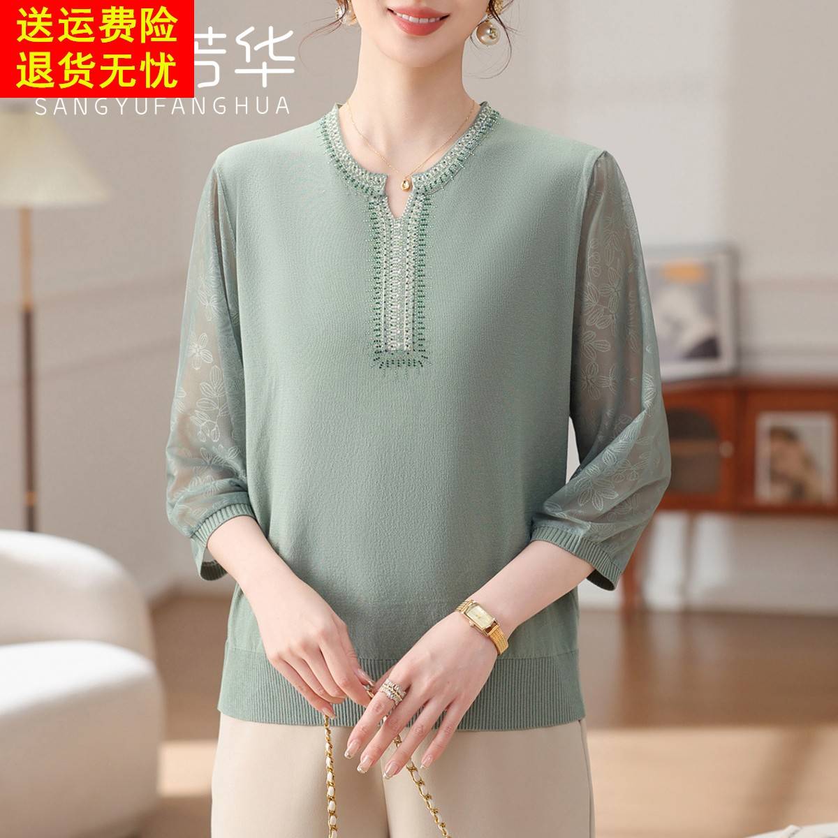 中年妈妈春装针织衫长袖上衣2025新款洋气打底小衫中老年女装T恤