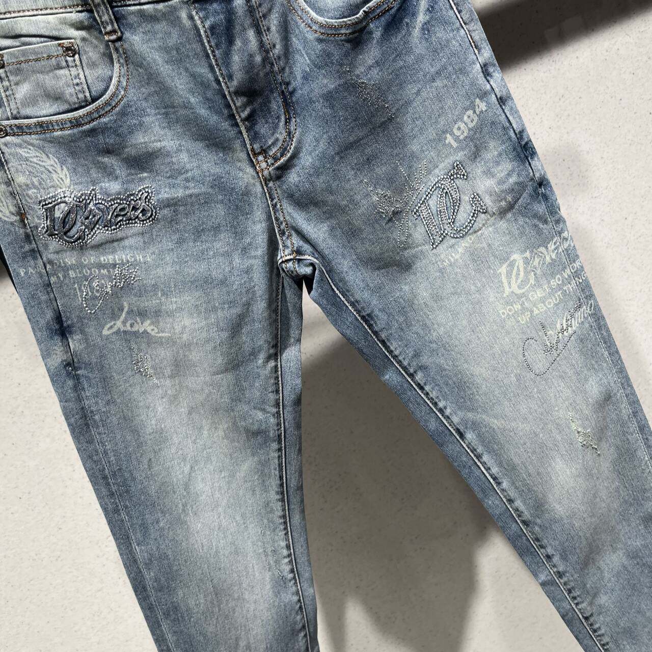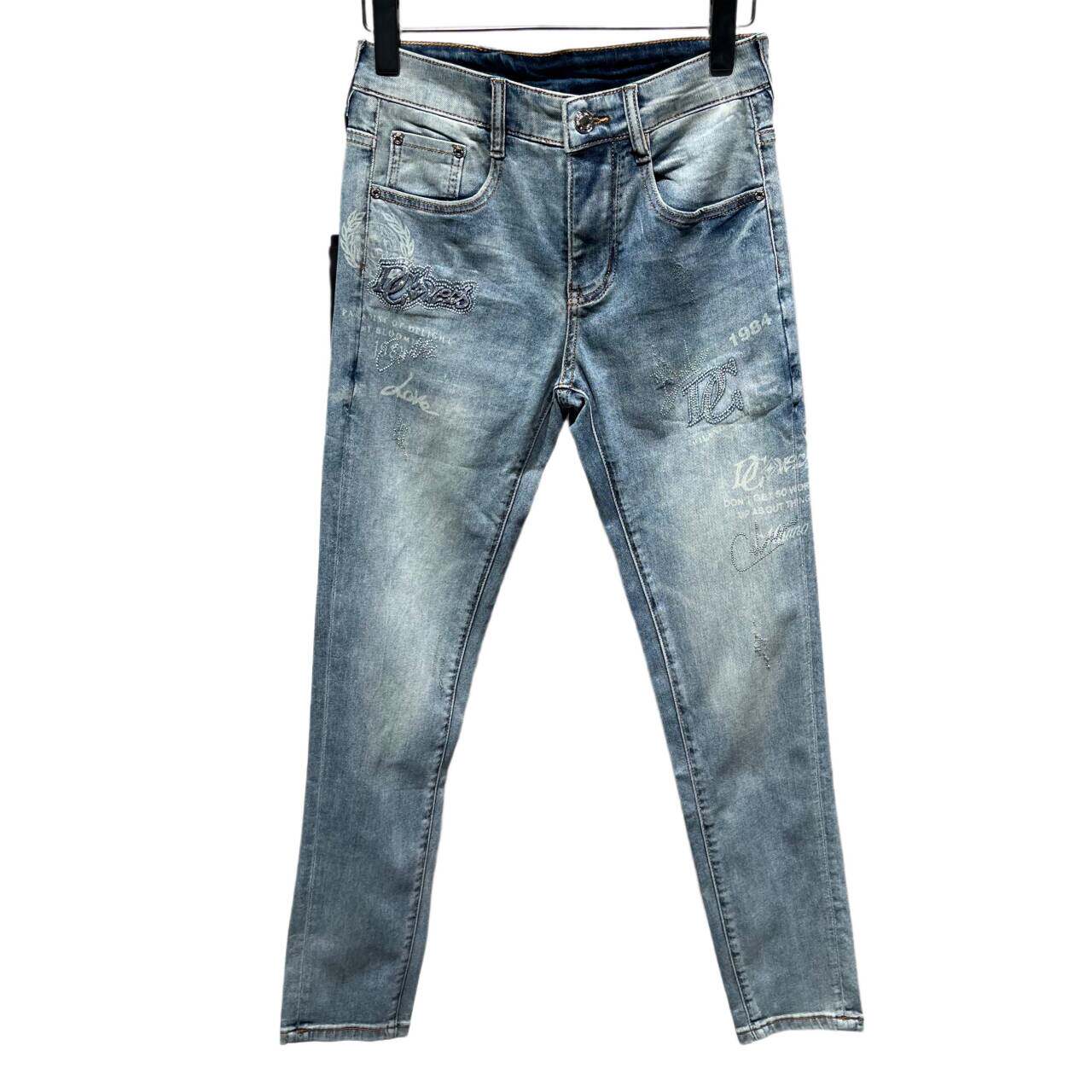 欧货2026春季男士牛仔裤小脚修身时尚个性印花百搭弹力休闲长裤子