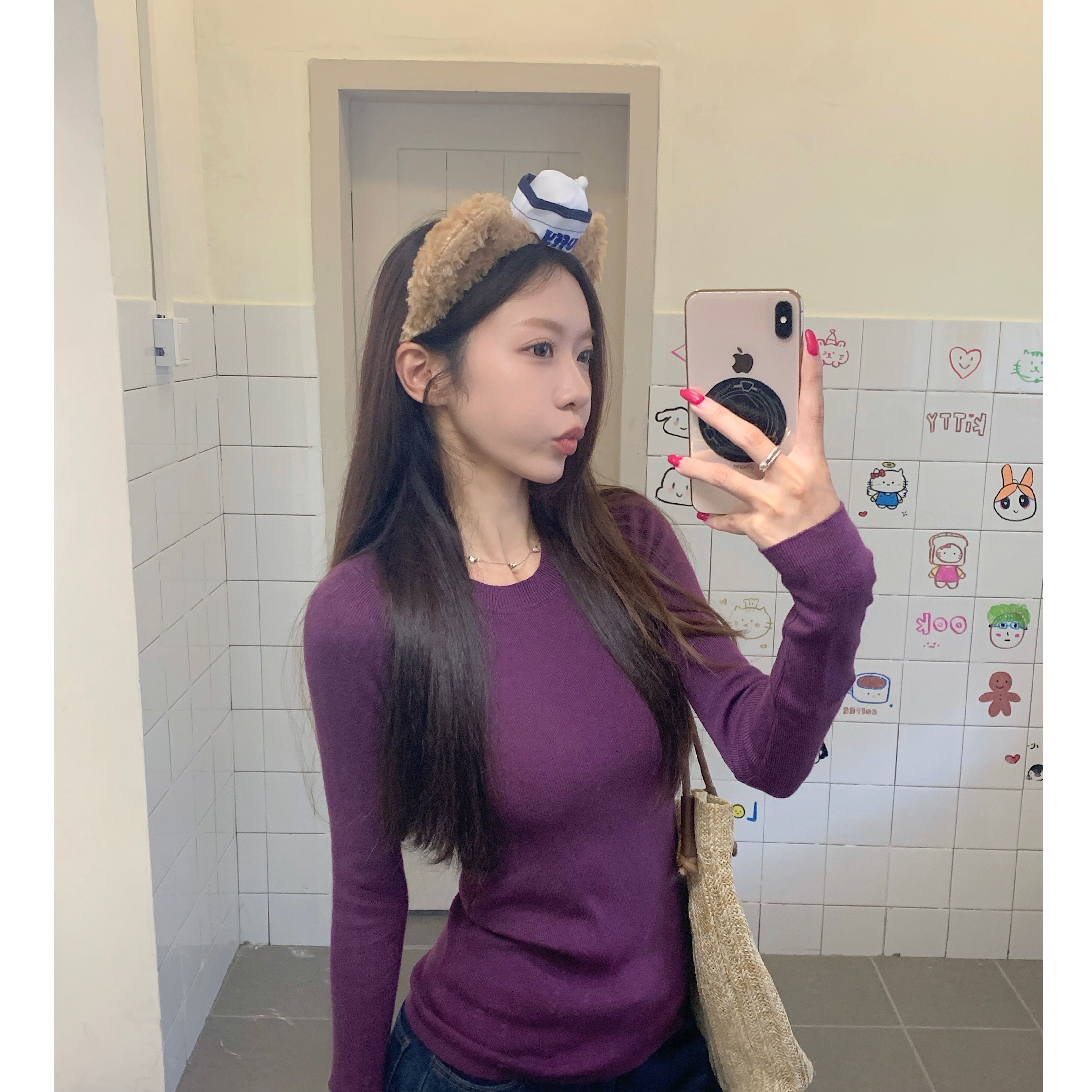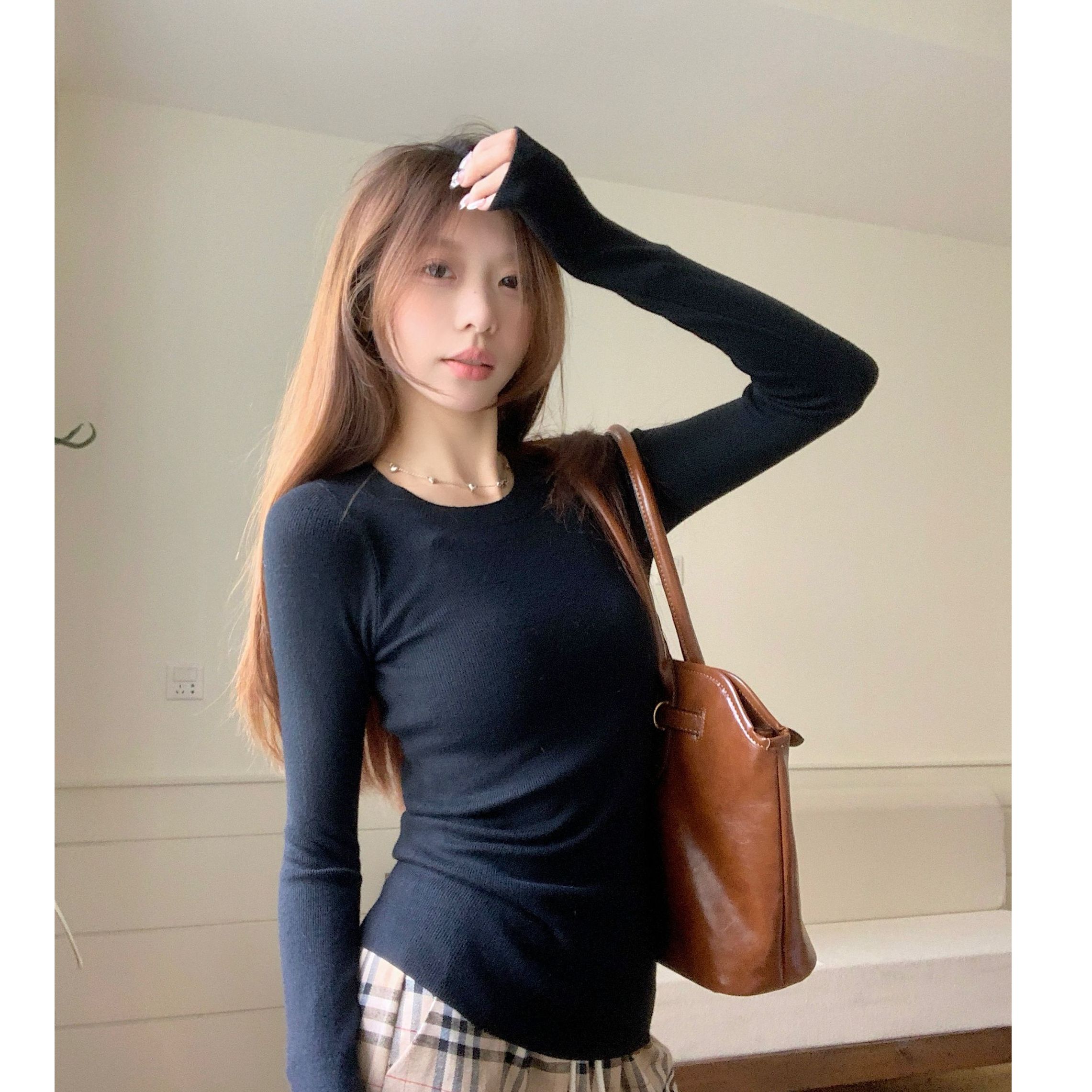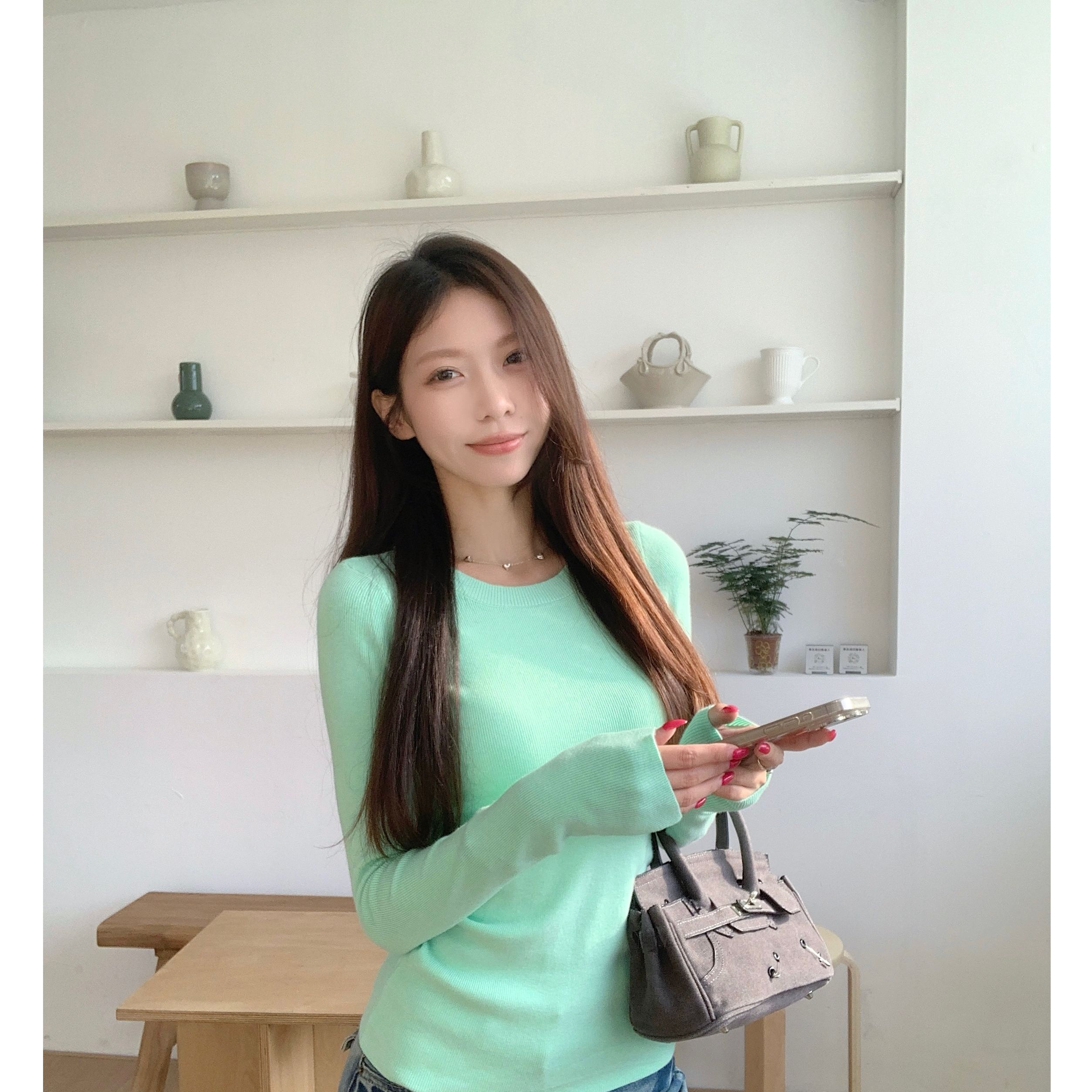 MosesQueen魔西女王螺纹圆领正肩针织衫女秋装休闲修身长袖上衣