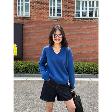 pusumede 普鲁士蓝 套头V领毛衣女长袖针织衫气质宽松慵懒上衣