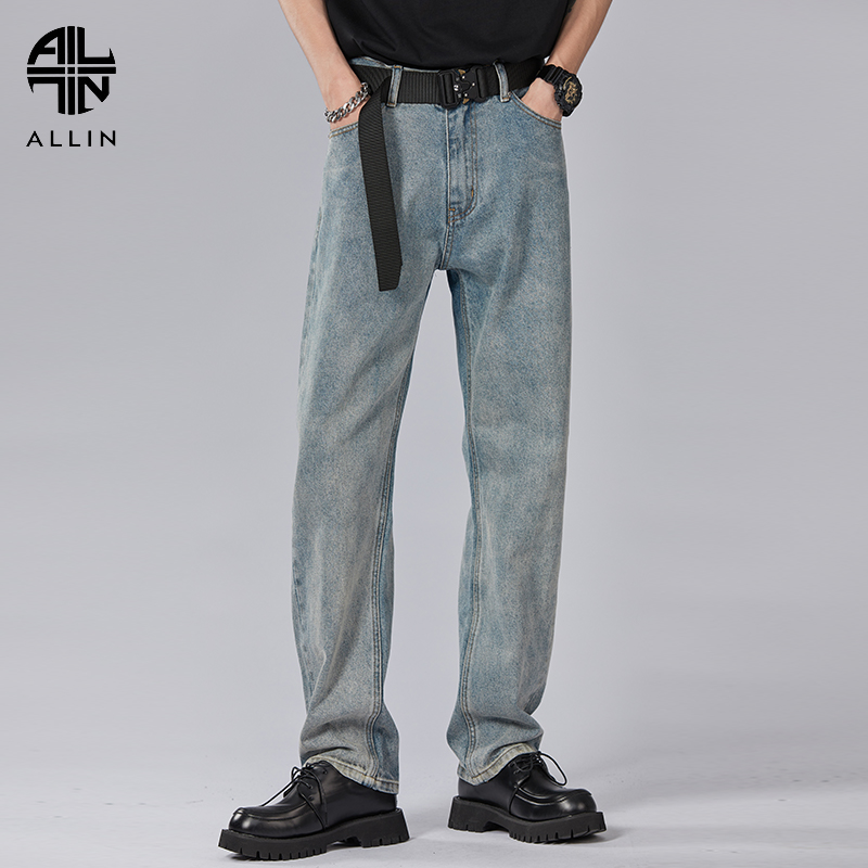 ALLIN 美式高街复古蓝牛仔裤男潮牌潮流水洗垂感直筒宽松阔腿裤子