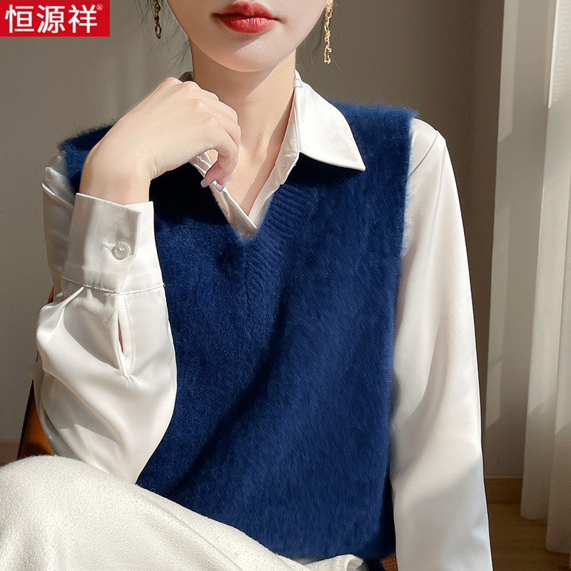 恒源祥100%纯羊毛衫女V领马甲扭花羊毛绒无袖背心针织打底衫坎肩