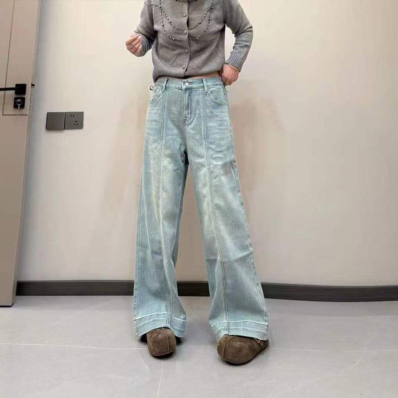 胖妹妹前压线阔腿牛仔裤加肥大码女装欧洲站纯色简约宽松遮胯长裤