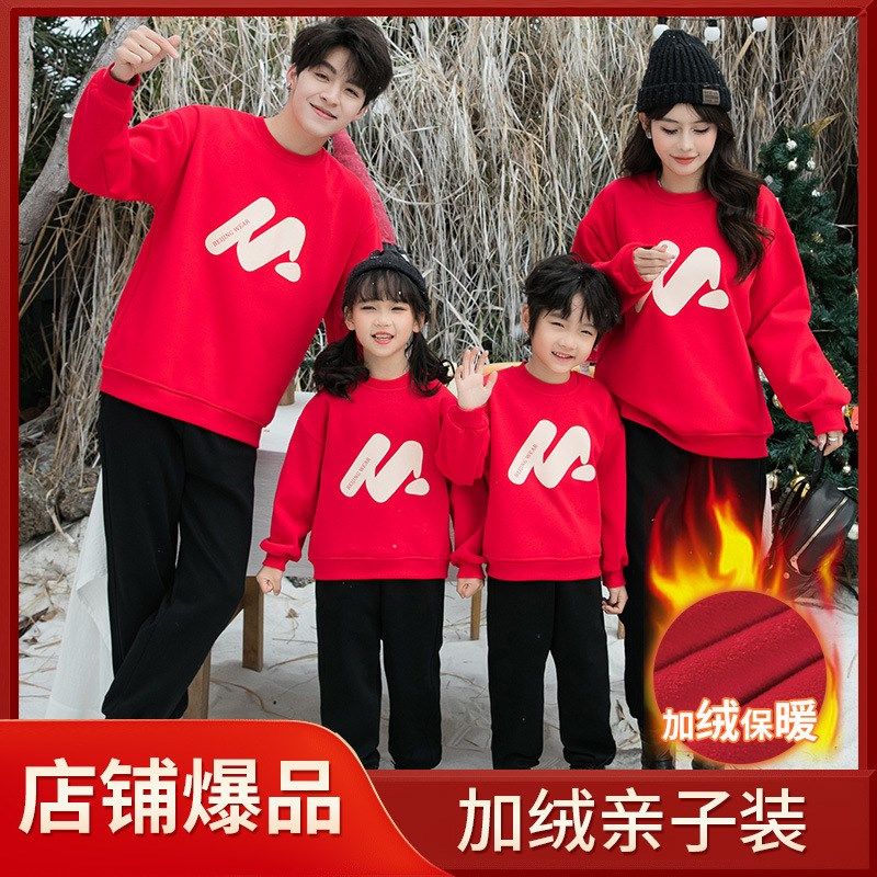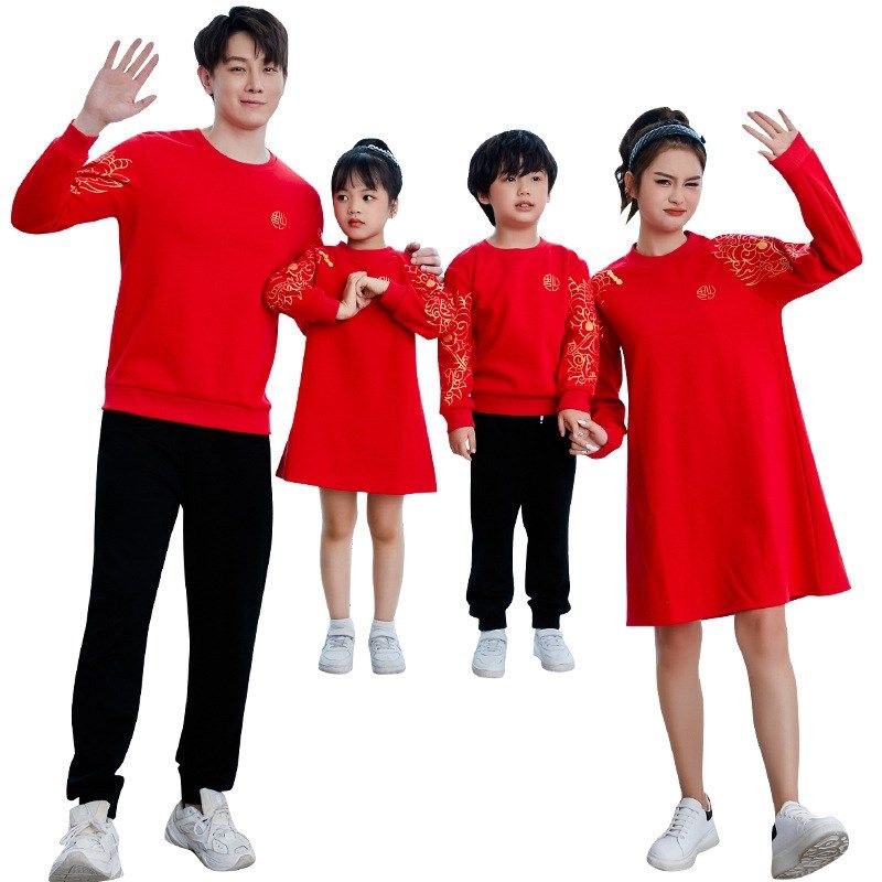 2024新款亲子装一家三口四口秋冬套装喜庆大红色卫衣母女连衣裙