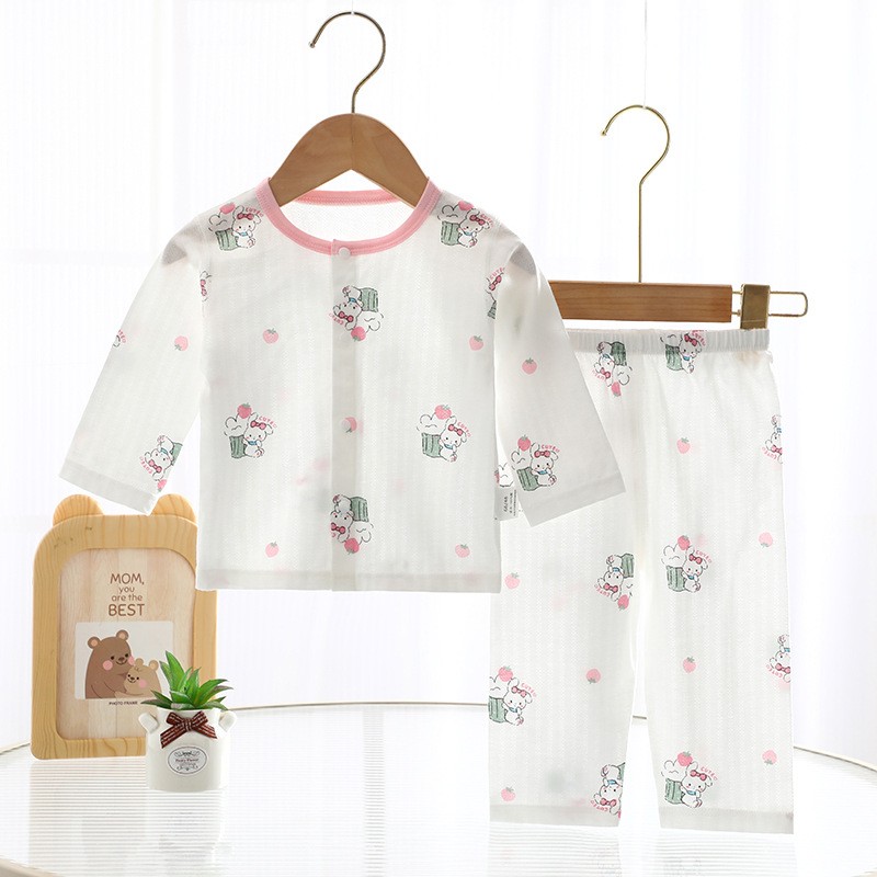 夏季婴儿纯棉薄款空调服套装长袖前开睡衣新生男女童无骨分体套装