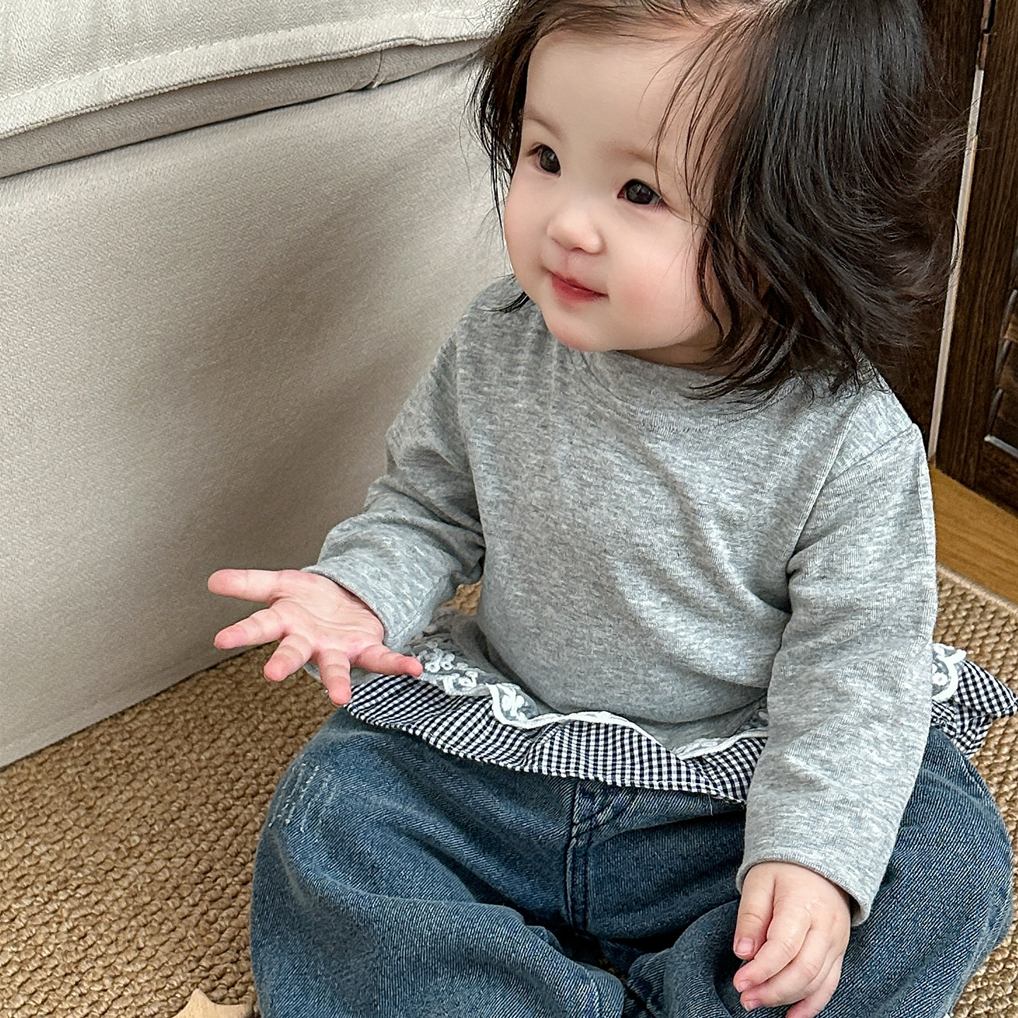 2025女宝宝春秋款套装婴儿格子拼接花边上衣休闲牛仔裤百搭两件套