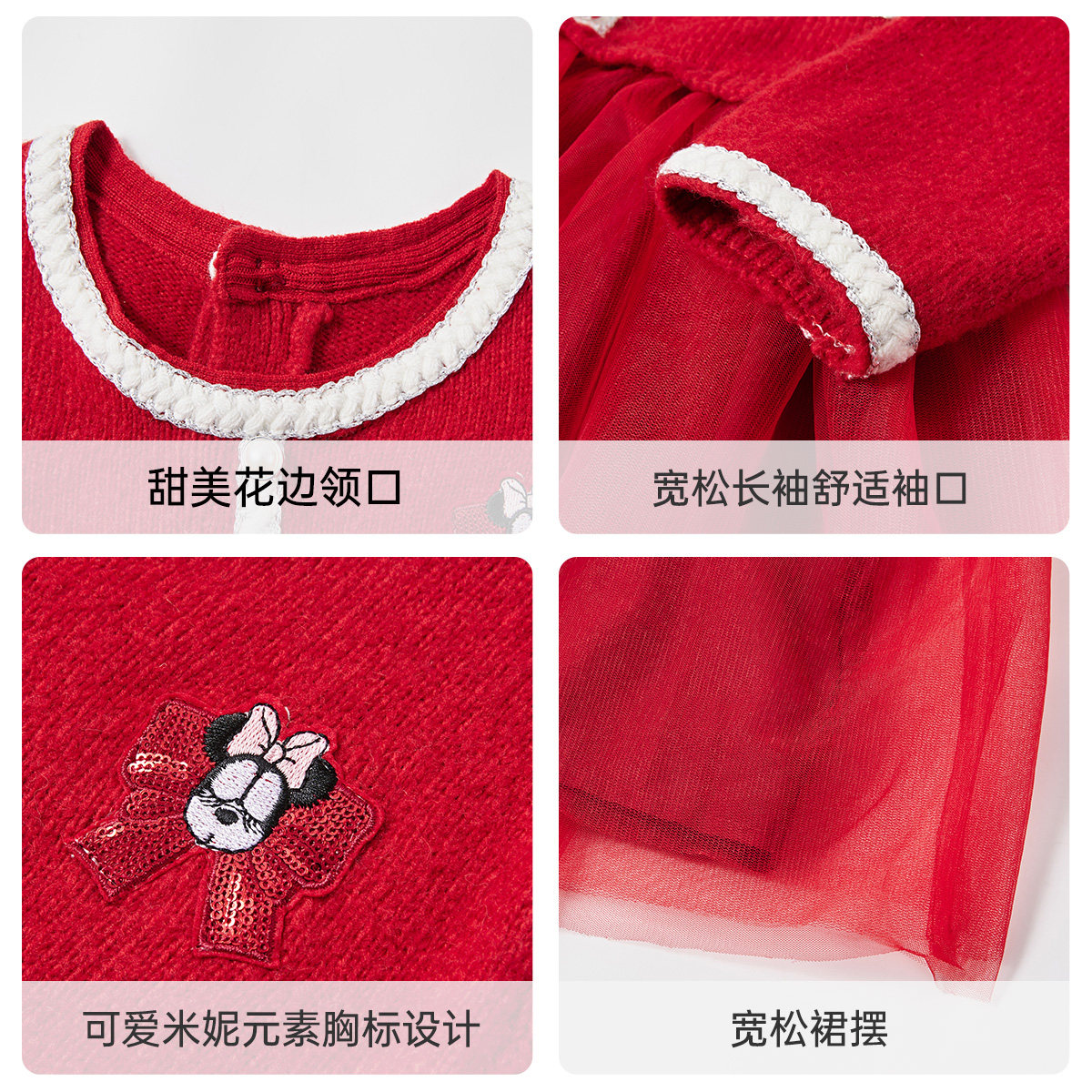 迪士尼童装儿童红色连衣裙冬季新款女童针织衫网纱裙冬裙拜年裙女