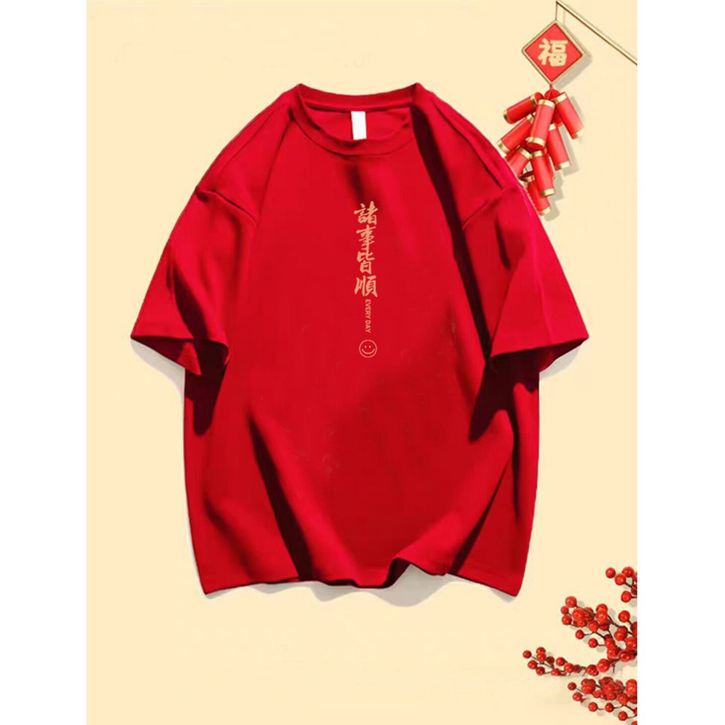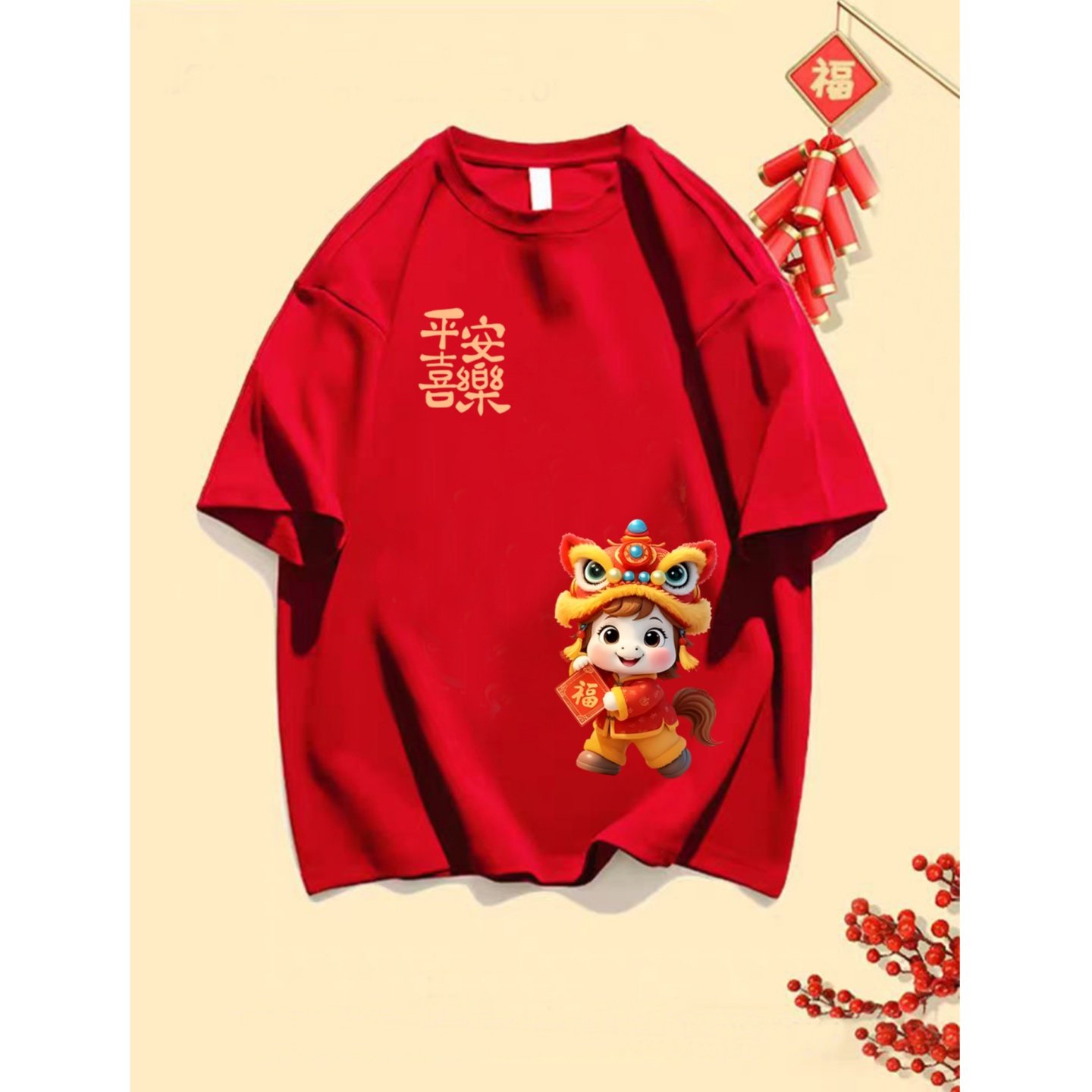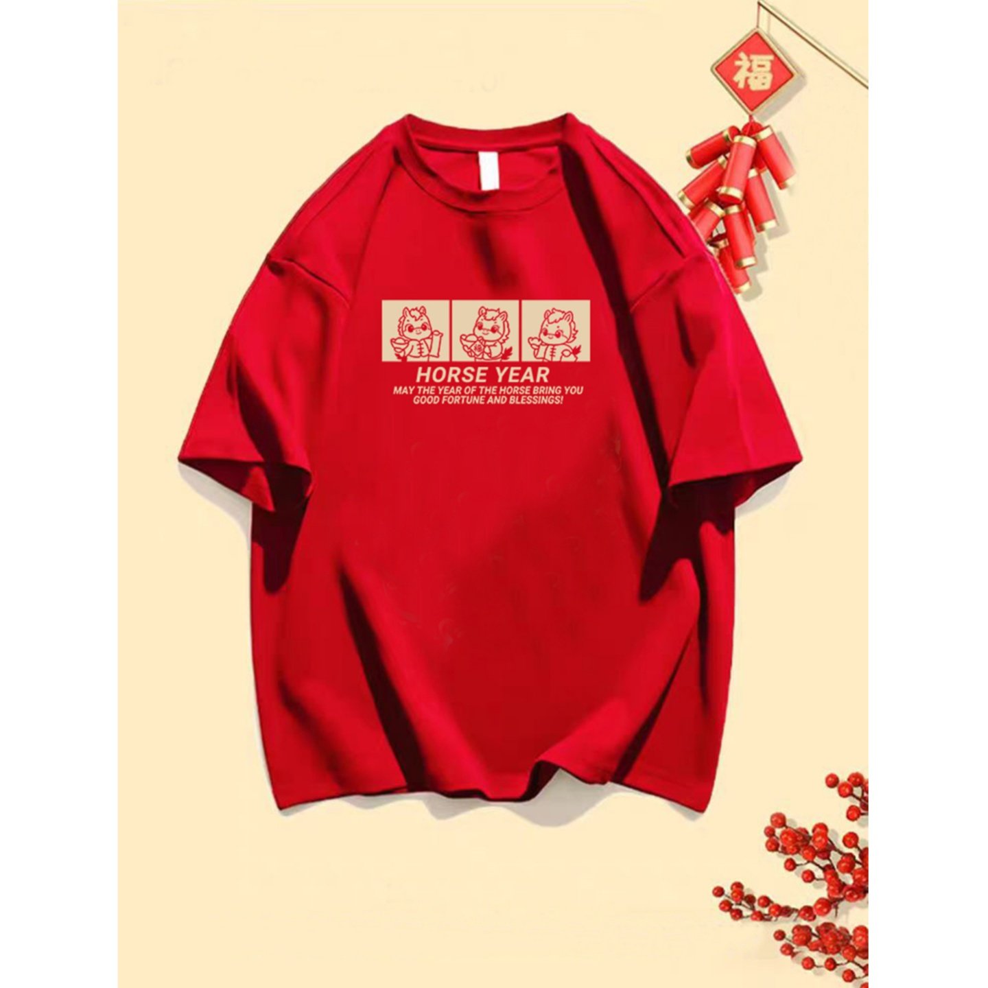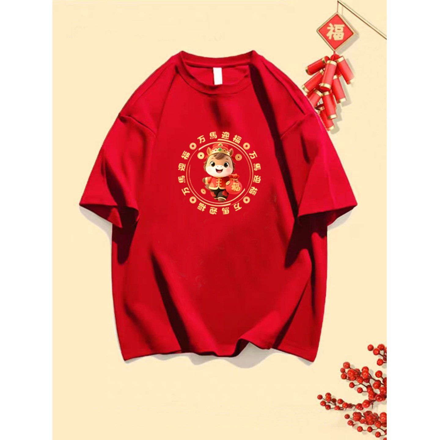 红色马年圆领短袖t恤女本命年2026过年装纯棉百搭中长款宽松上衣