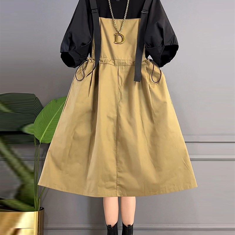 胖mm灯笼七分袖打底衬衫抽腰显瘦背带连衣裙套装夏季新款大码女装