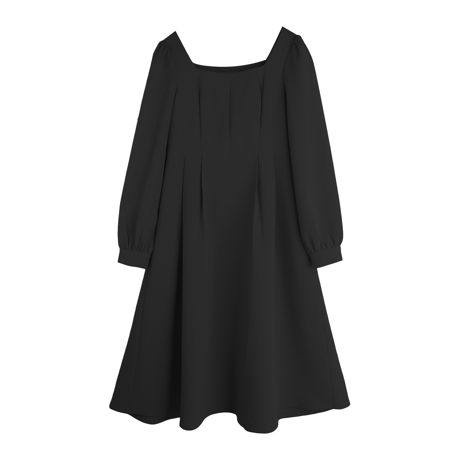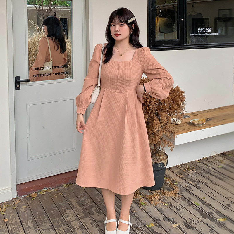 大码女装200斤春装胖mm气质简约方领收腰显瘦法式长袖中长连衣裙