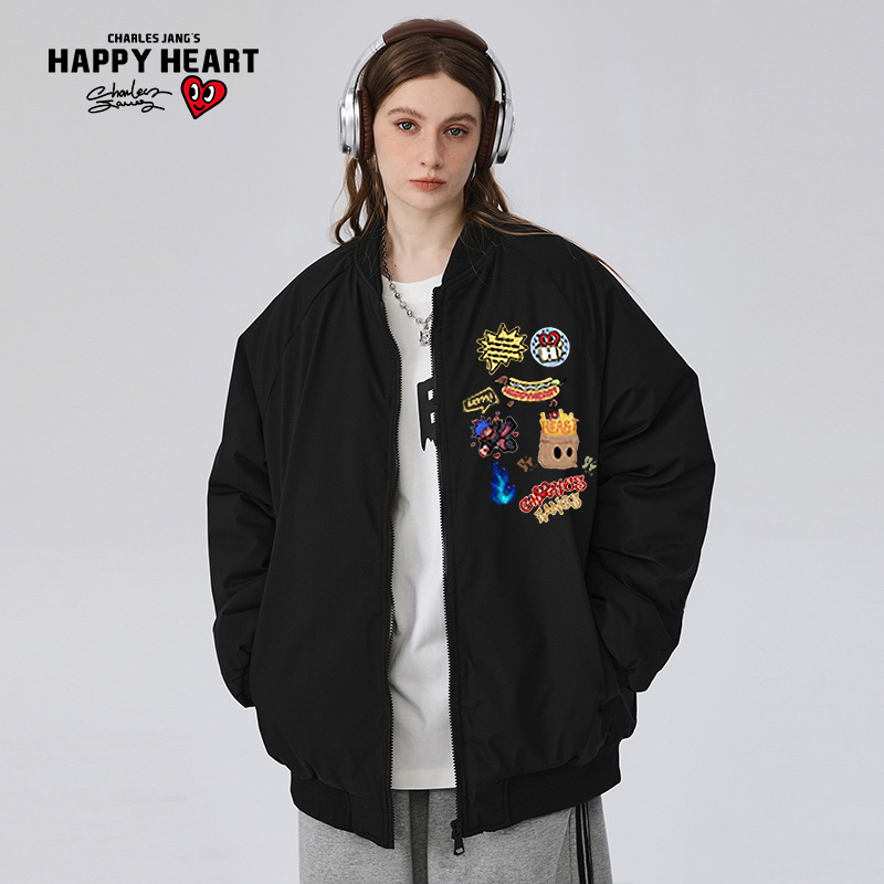 查尔斯桃心美式复古涂鸦冬季新款情侣棒球领加厚面包服棉服外套男