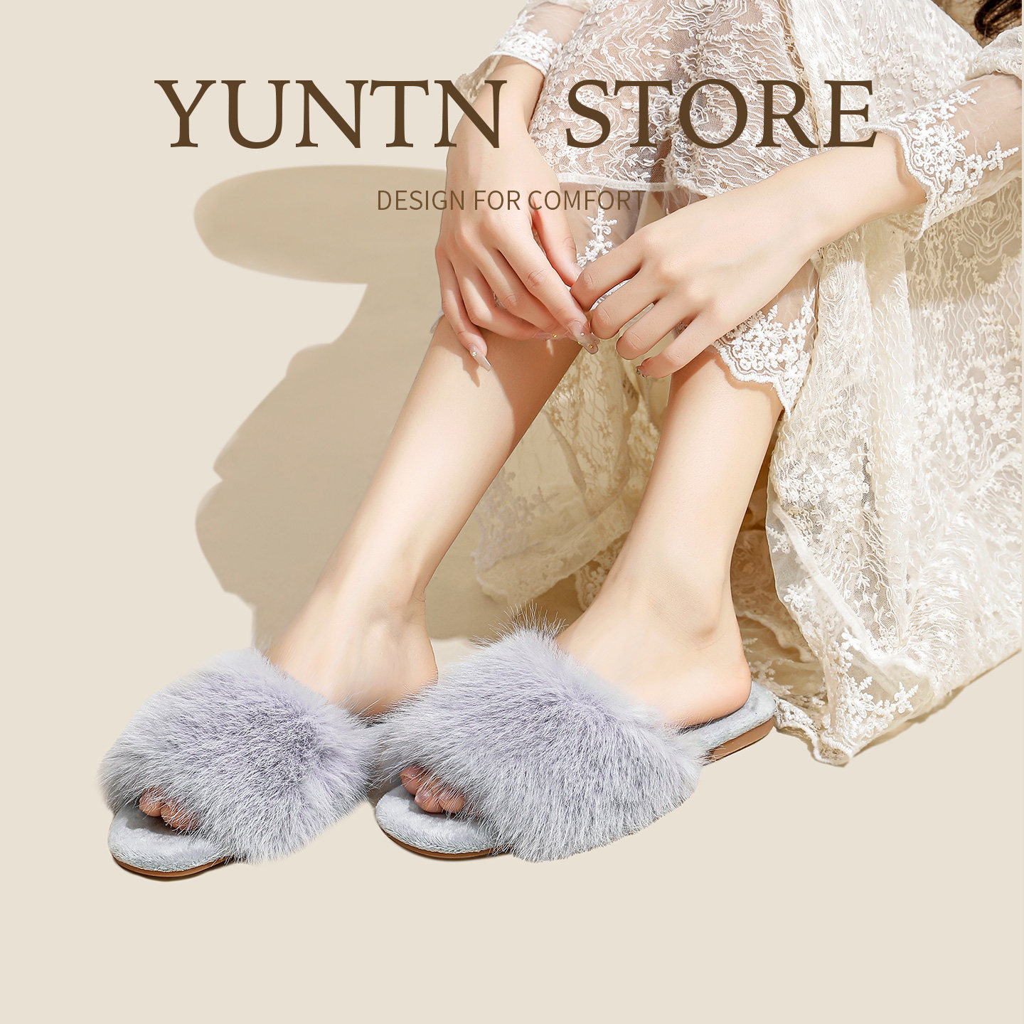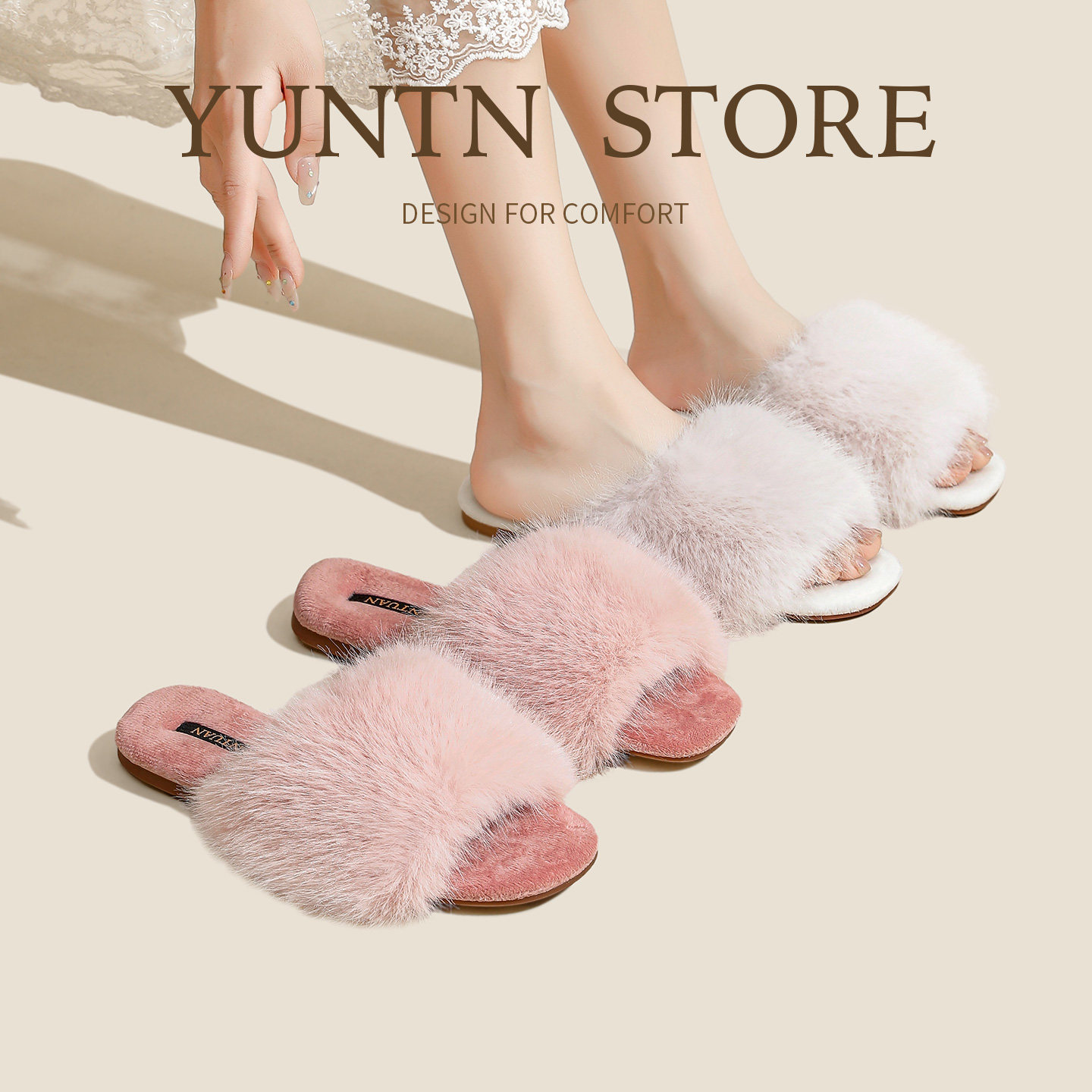 开口防滑保暖甜美气质毛毛棉拖鞋