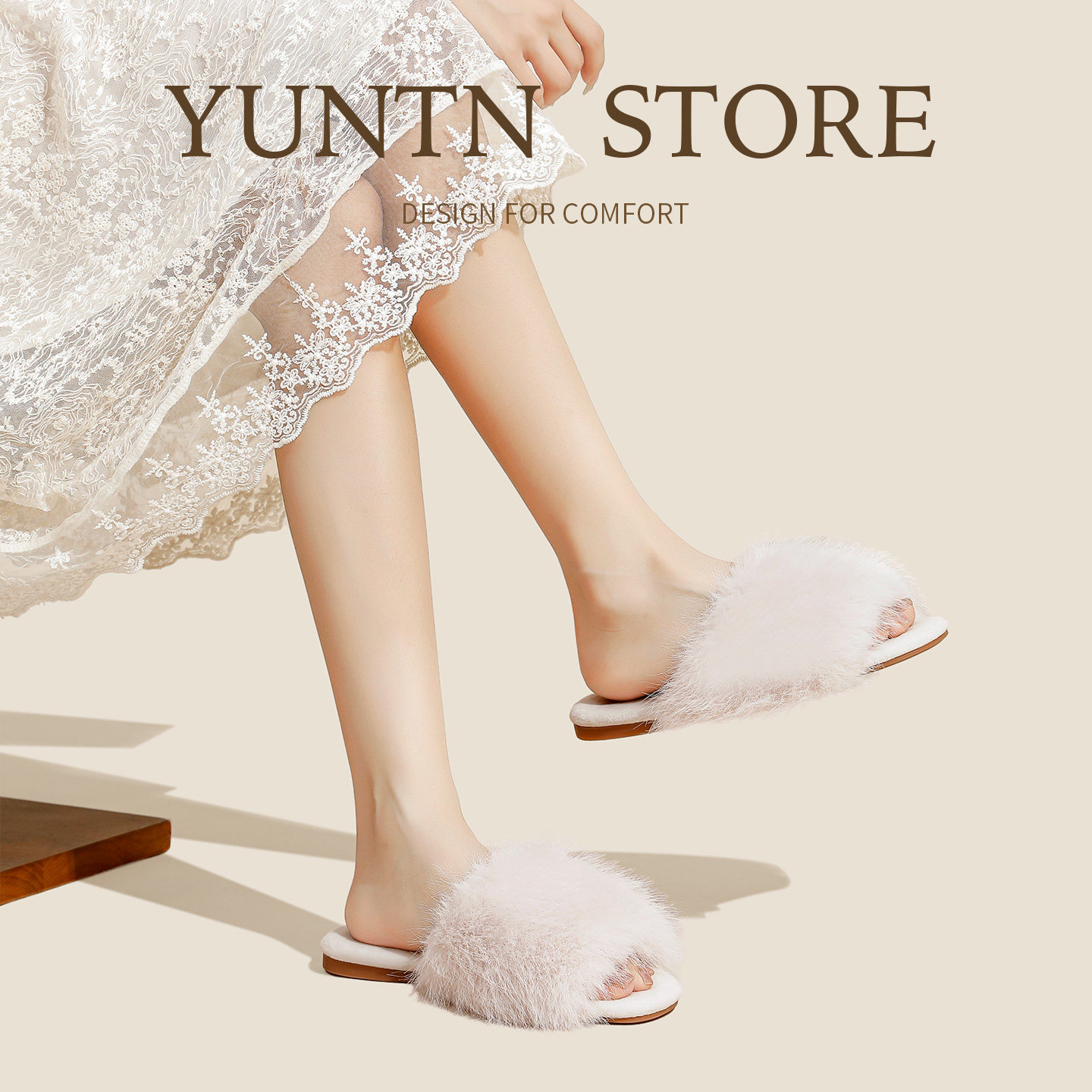 秋冬新品温柔气质甜美软糯毛毛棉拖鞋女开口保暖防滑牛筋底居家鞋