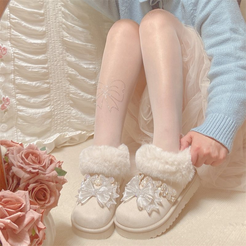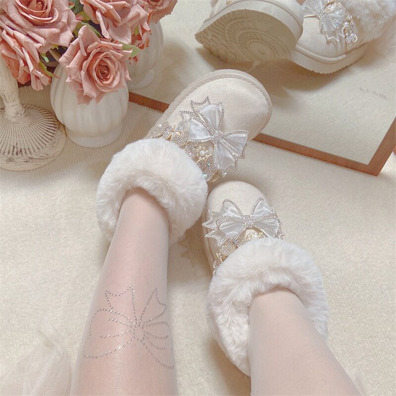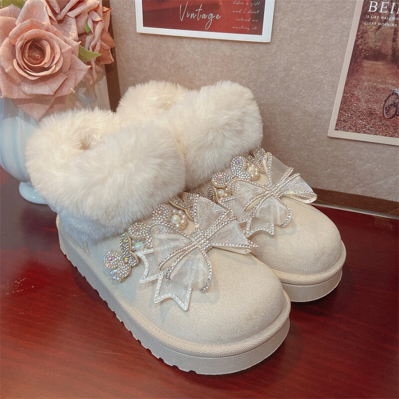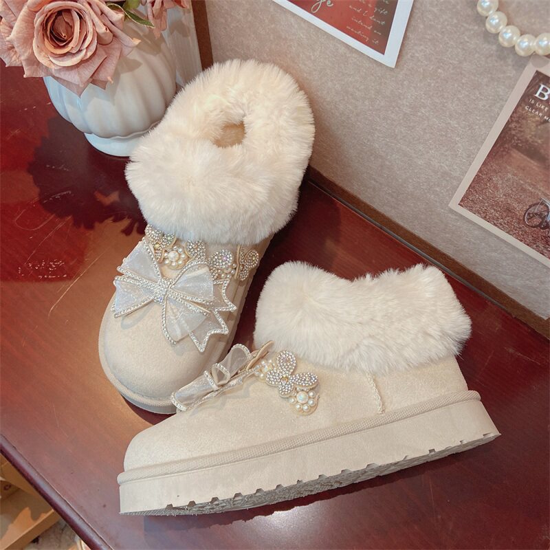 2025冬季新品皮毛一体雪地靴甜美蝴蝶结水钻白色百搭毛毛女大棉鞋