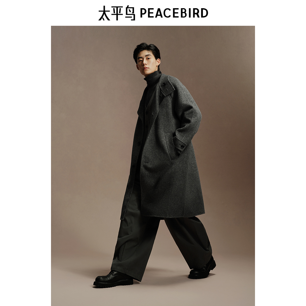 【含羊驼毛】太平鸟男装立领毛呢大衣男冬新款羊毛呢子外套