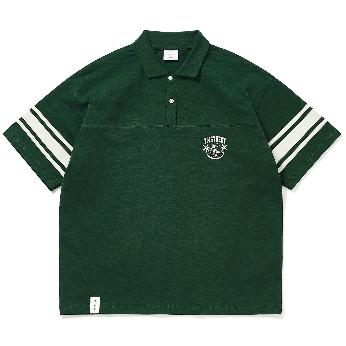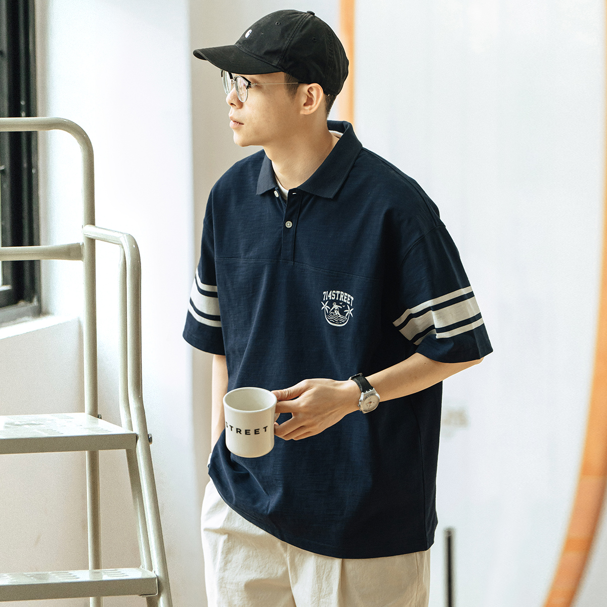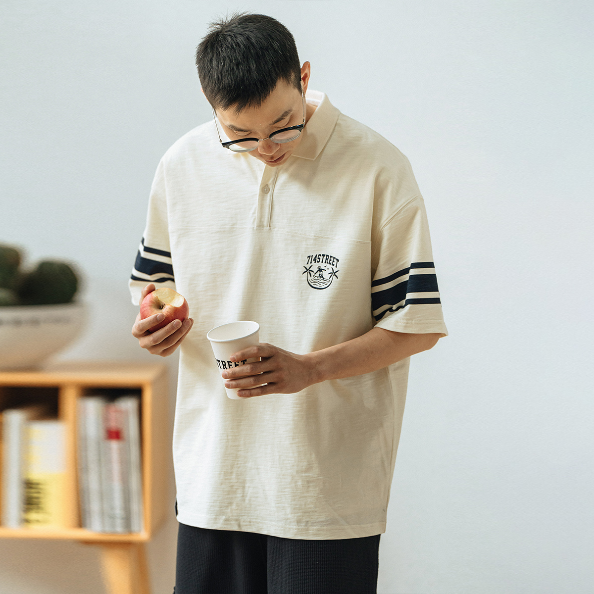714street美式复古Polo衫男夏季款撞色宽松五分袖上衣潮牌短袖t恤