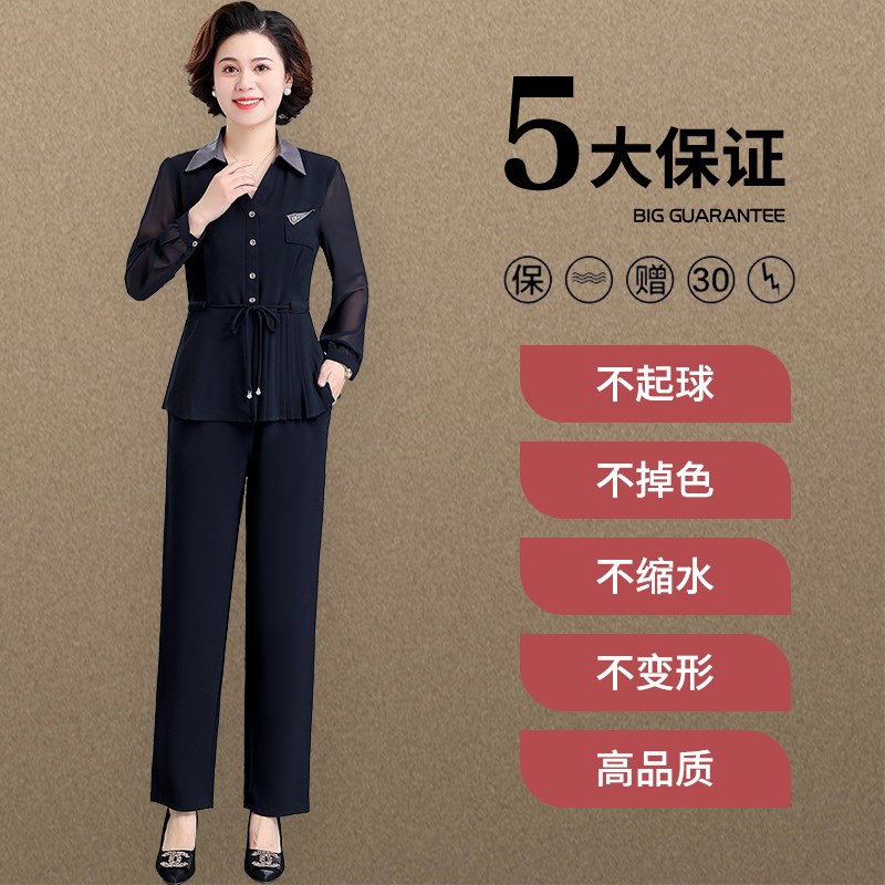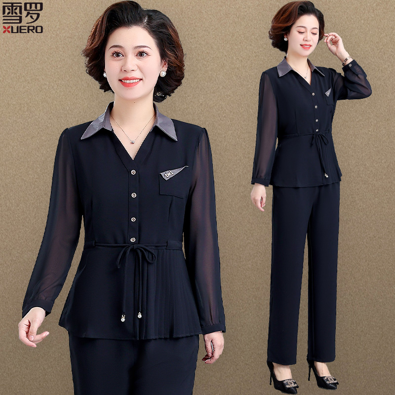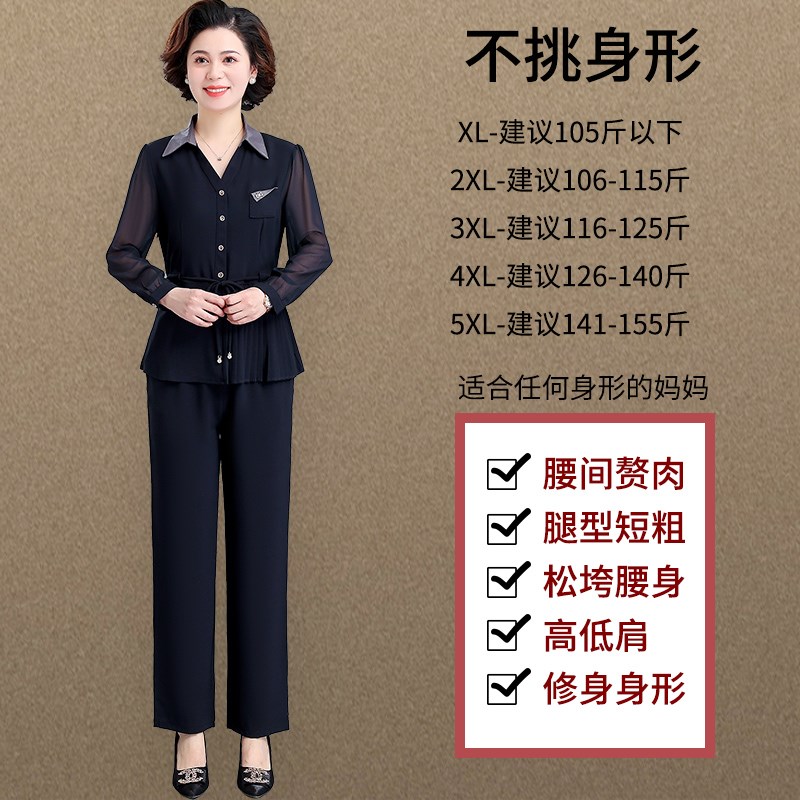 阔太太衣服中年妈妈夏装套装中老年女长袖雪纺衬衫上衣春秋两件套