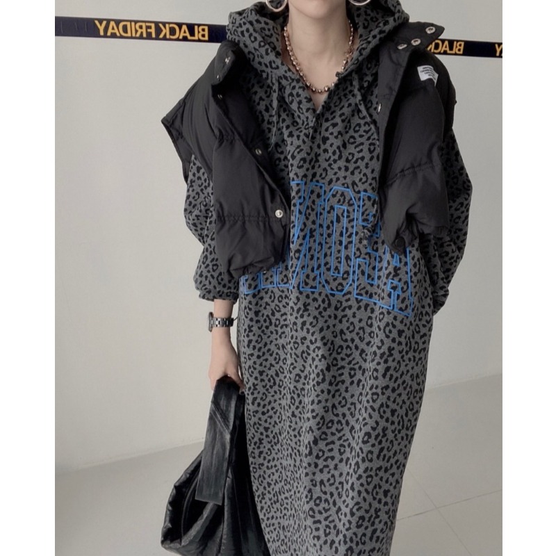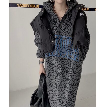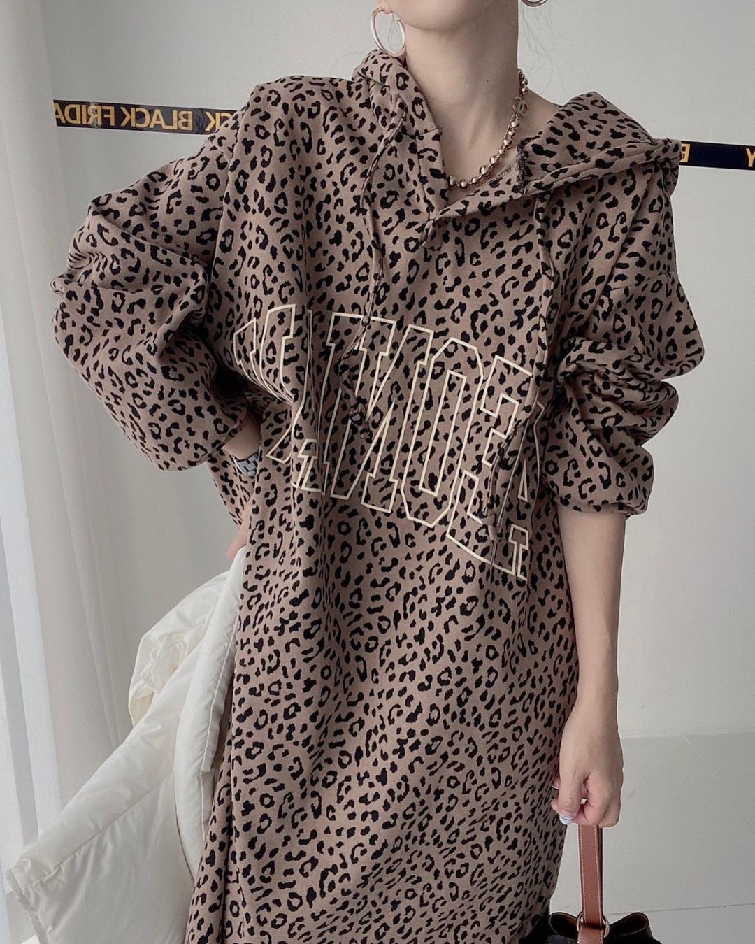 韩国chic连衣裙!2024秋冬大码胖MM豹纹连帽时尚宽松中长款裙子潮