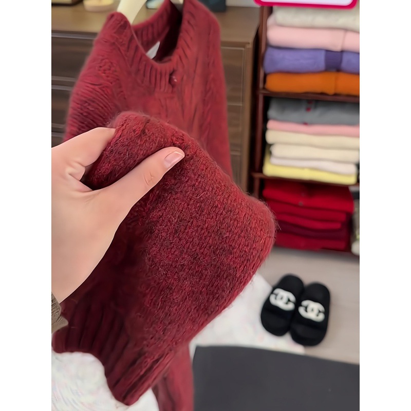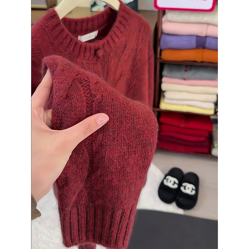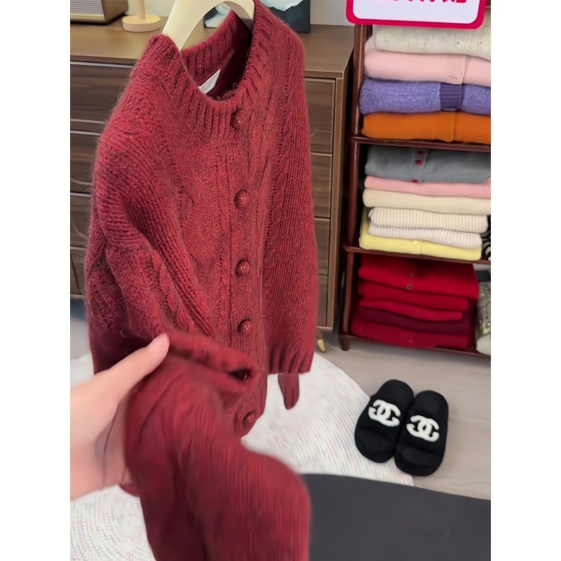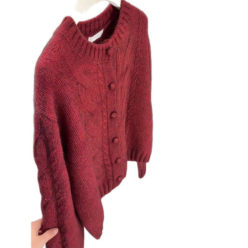 欧货复古女装红色圆领毛衣针织开衫2025春季新款宽松休闲气质上衣
