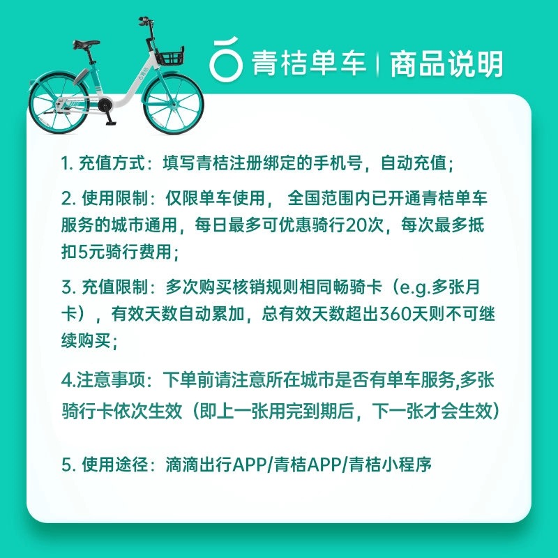 【直充到账】滴滴青桔单车骑行90天季卡 共享自行车3月卡骑行天卡