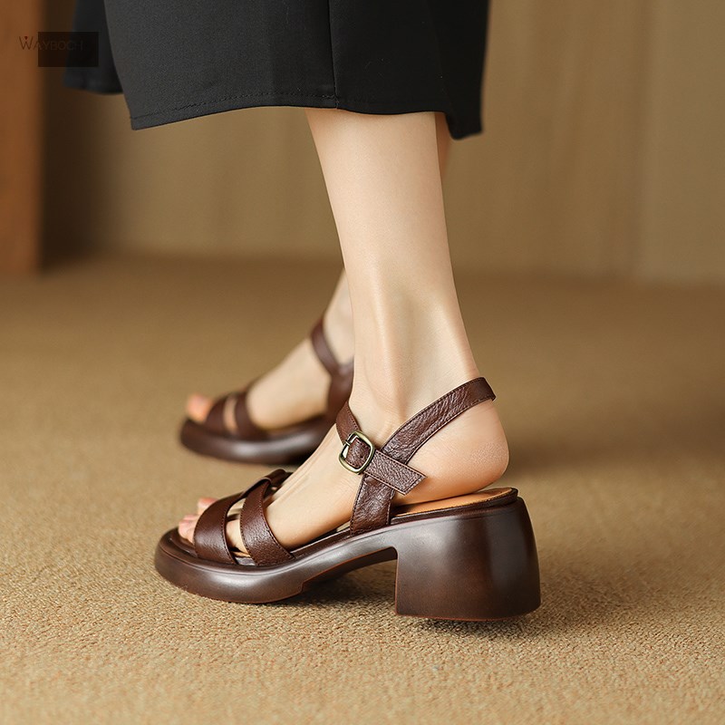 头层牛皮 厚底防水台一字带凉鞋z 露趾粗跟高跟夏季真皮凉鞋女轻
