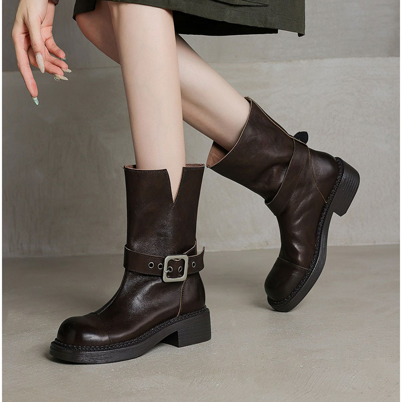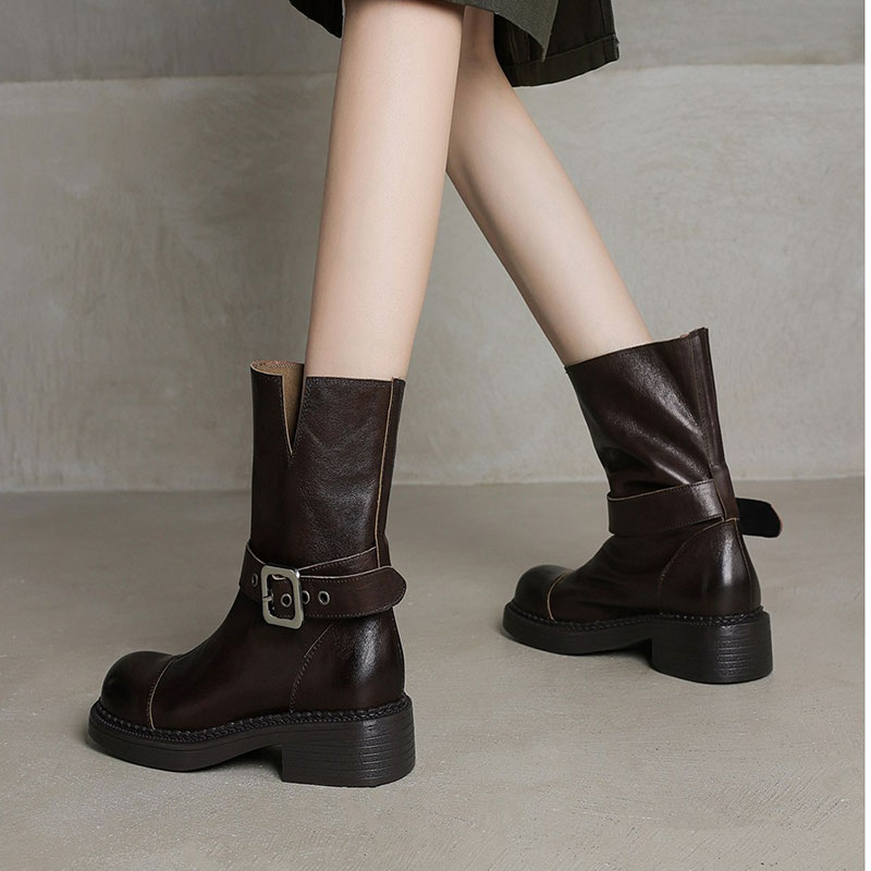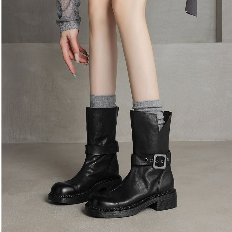 英伦风皮带扣马丁靴女款秋冬季厚底短靴软皮靴子瘦瘦靴中筒机车靴