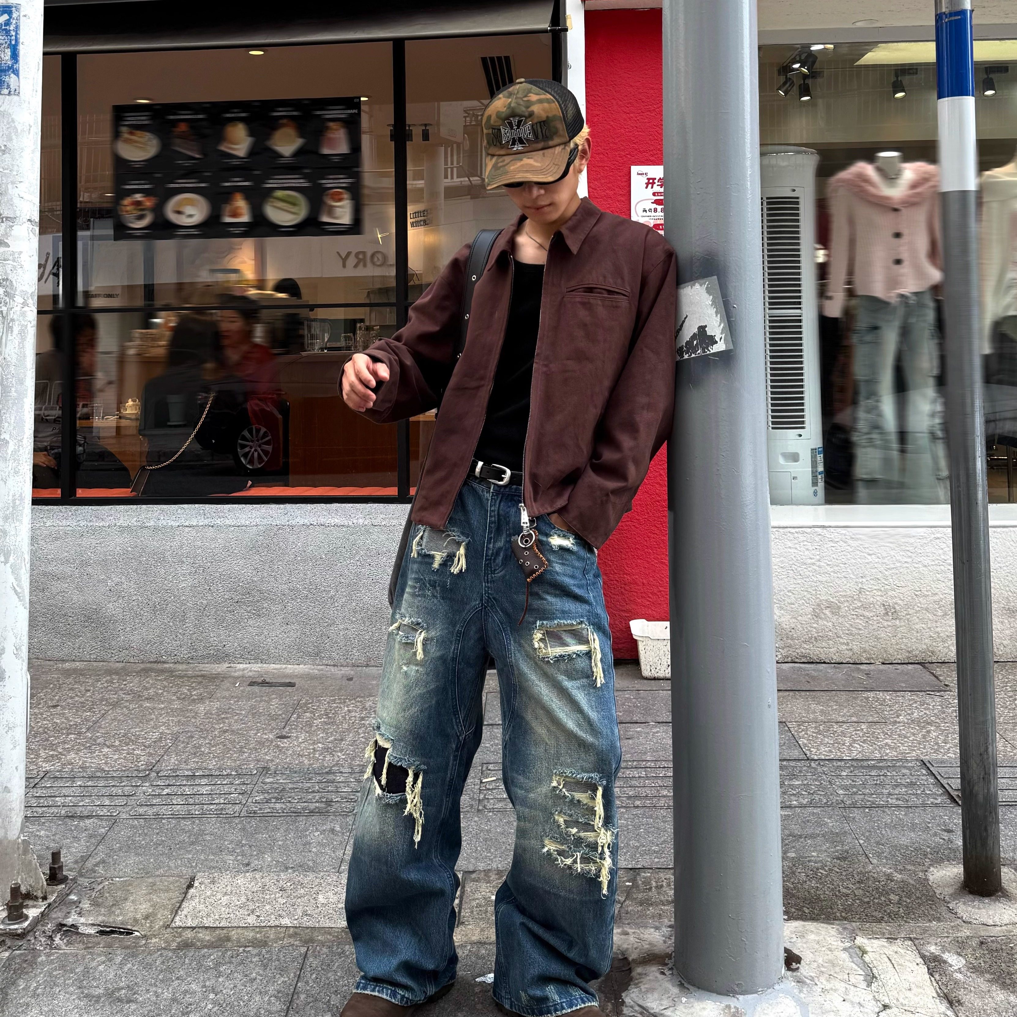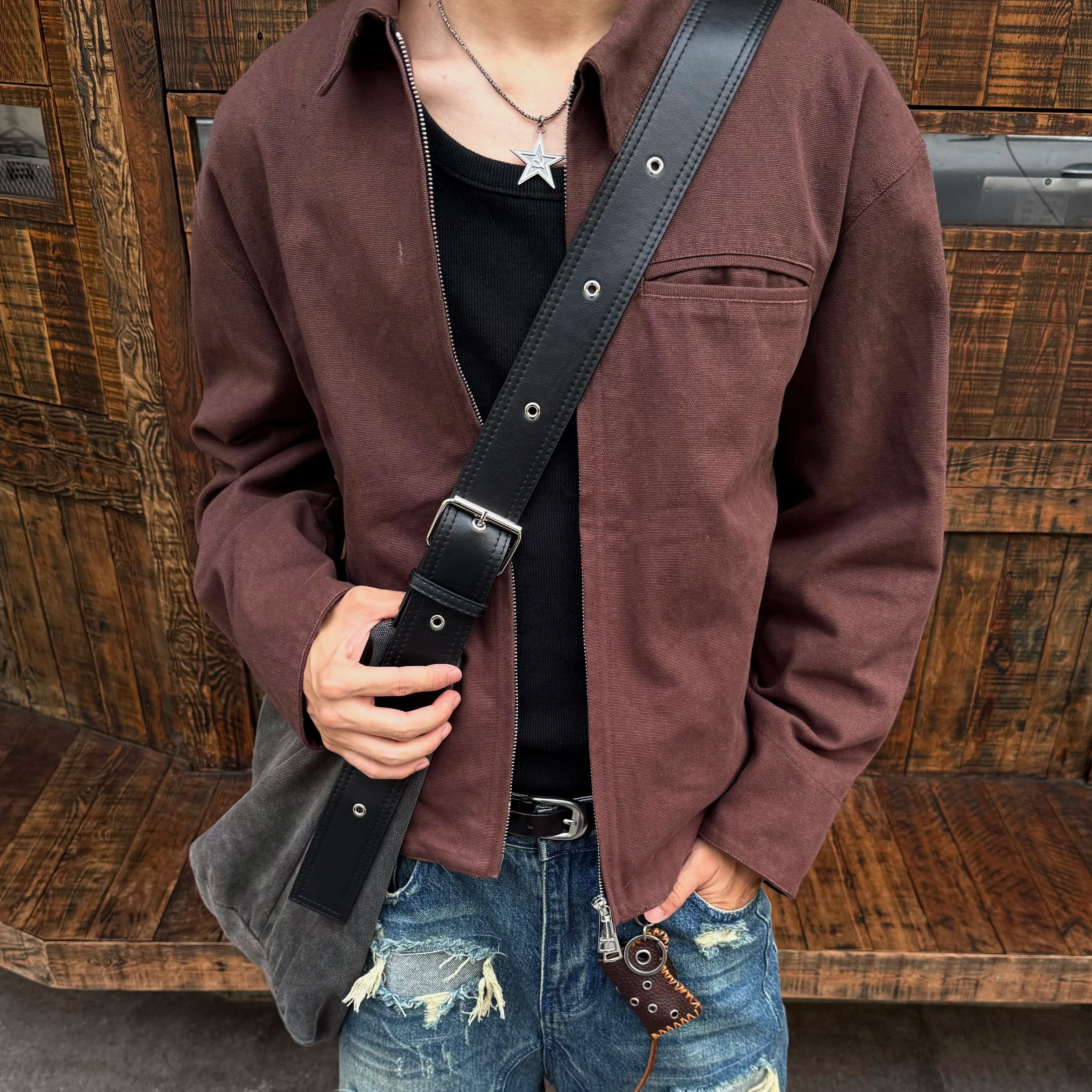 清仓Vcatecx棕色水洗帆布底特律夹克boxy短宽翻领工装外套美拉德