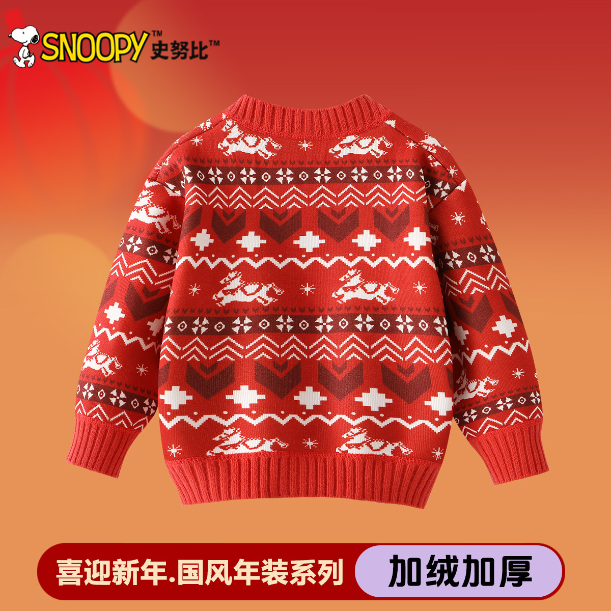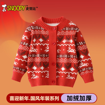 史努比女童红色开衫毛衣2026马年新年款男童冬季针织衫儿童拜年服