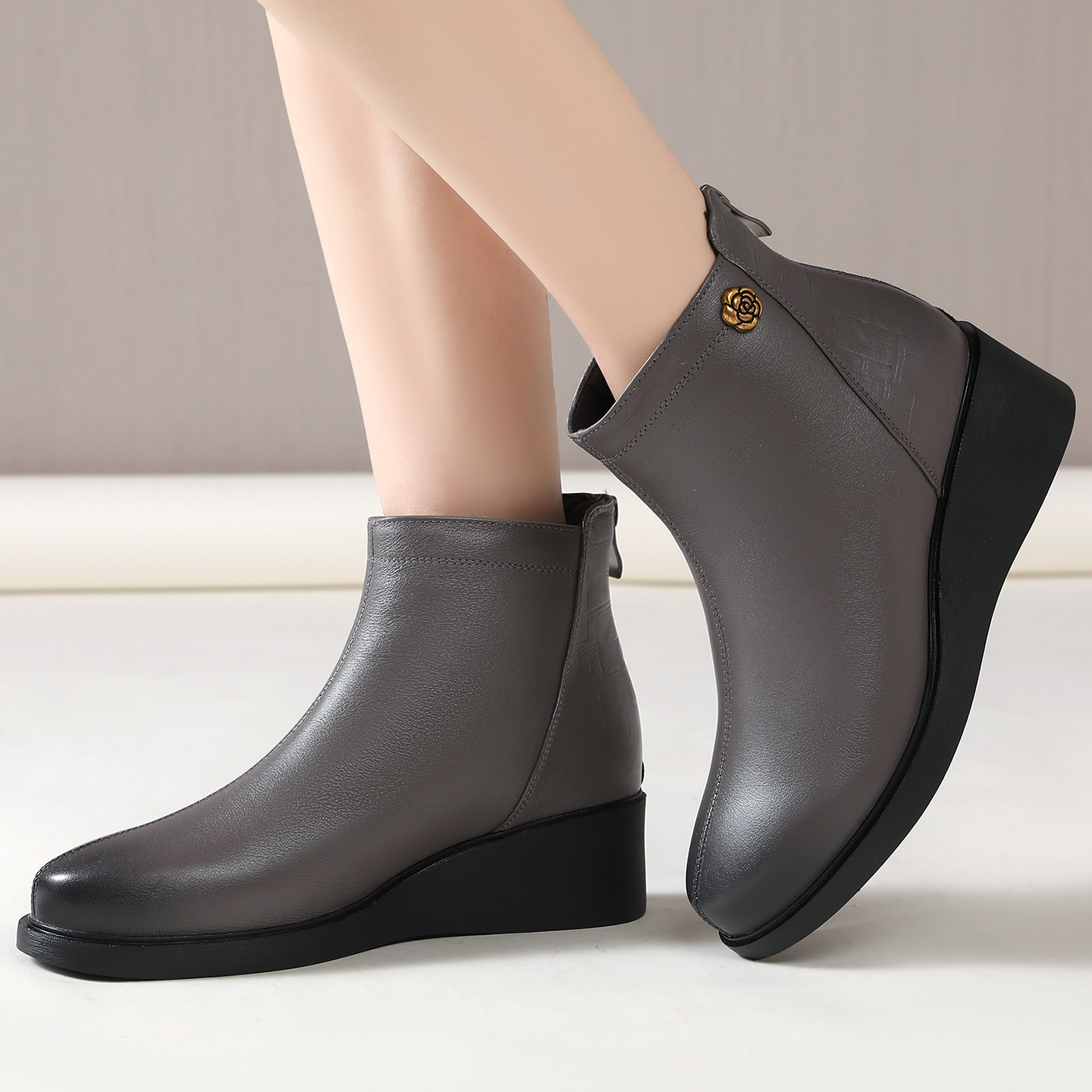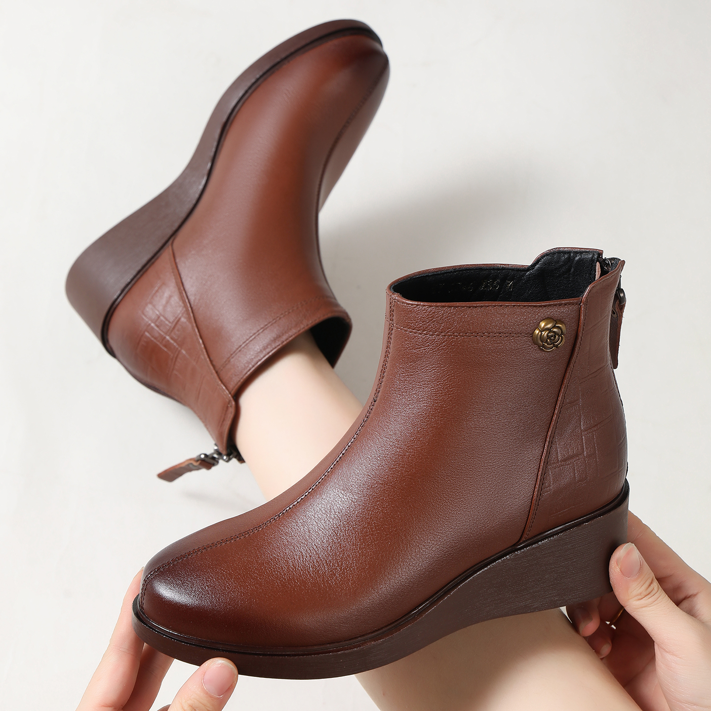 秋冬季坡跟中年妈妈短靴女单靴软底加绒棉鞋大码女靴保暖真皮靴子
