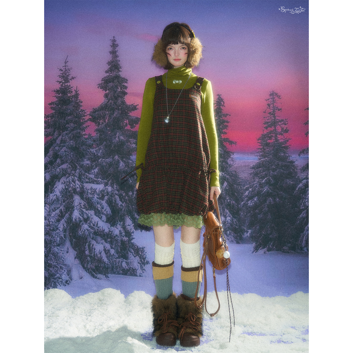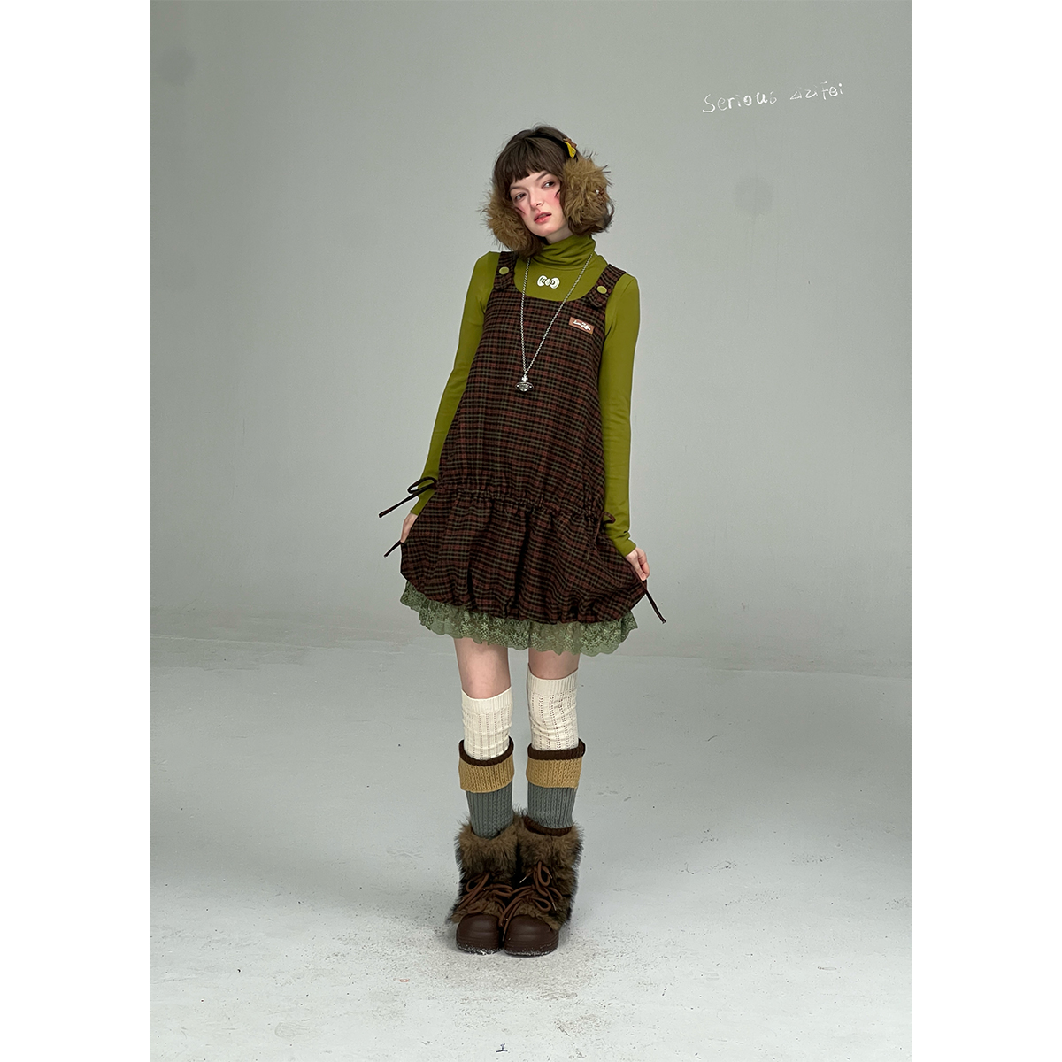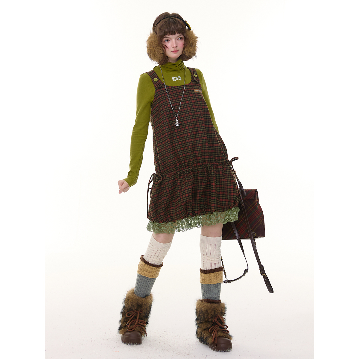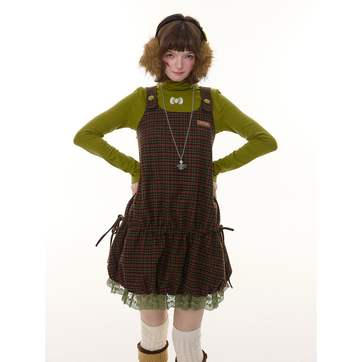 ziziFei秋冬季美式复古新款设计感红色格纹蕾丝下摆背心连衣裙女