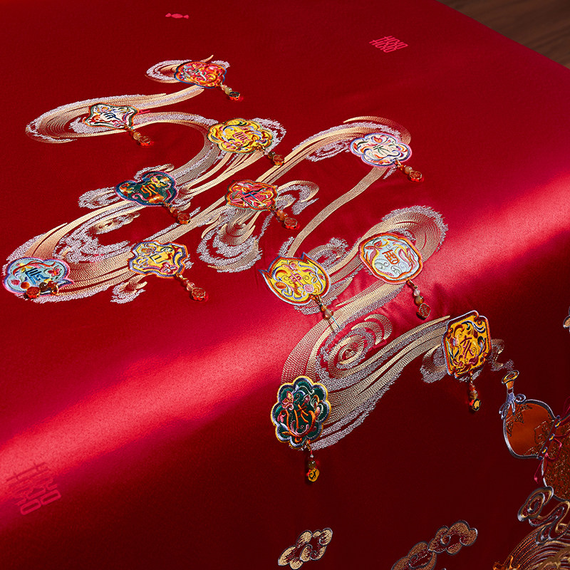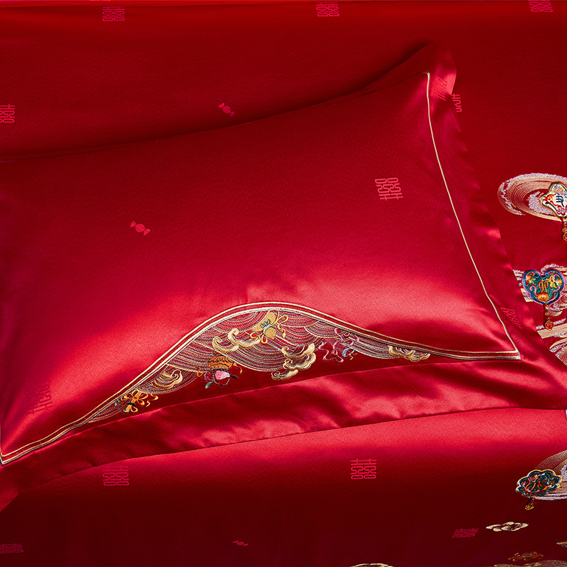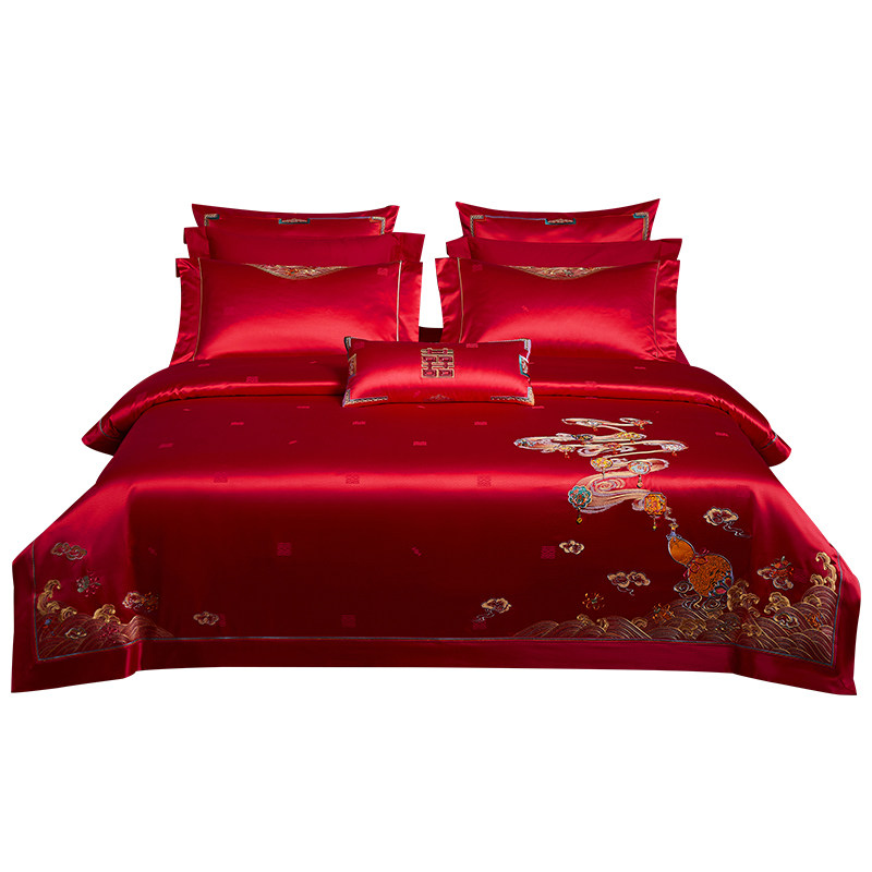 高档婚庆全棉纯棉四件式婚庆陪y嫁刺绣大红色床单被套新中式床上