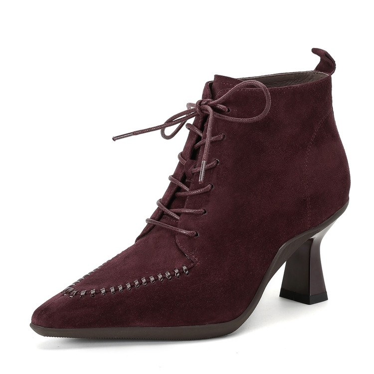 软底真皮~7cm粗高跟系带短靴女秋冬及踝裸靴法式复古尖头马丁靴鞋