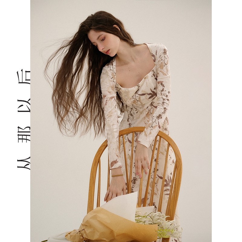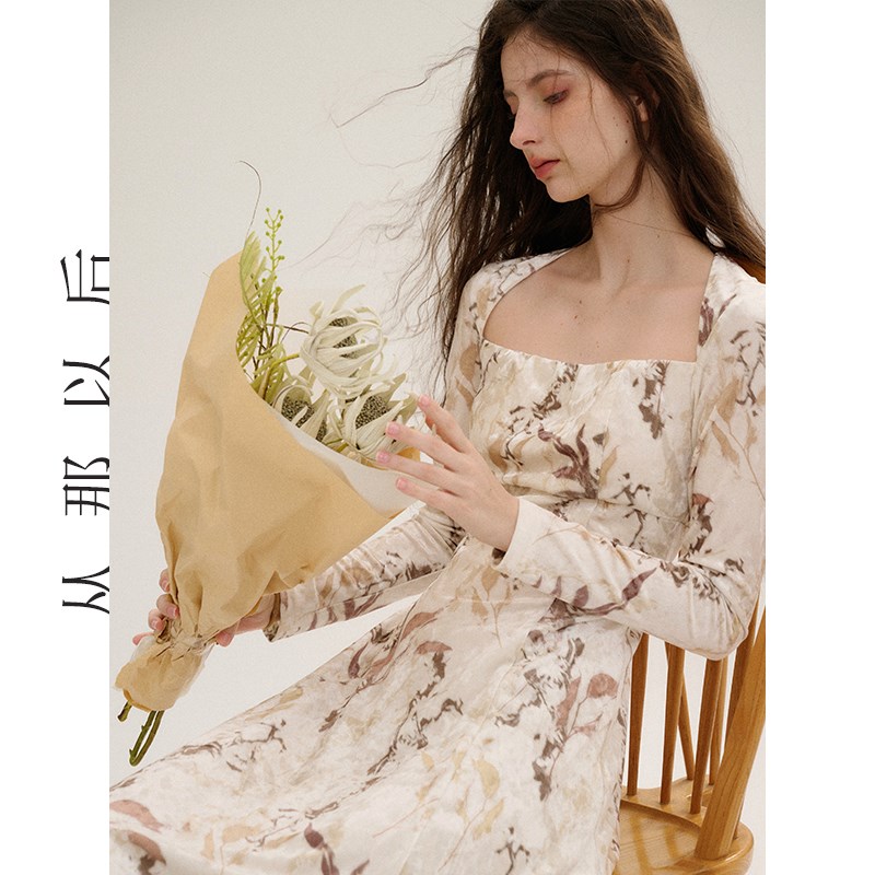 从那以后法式气质碎花裙子方领茶歇长裙修身a字丝绒连衣裙女秋冬