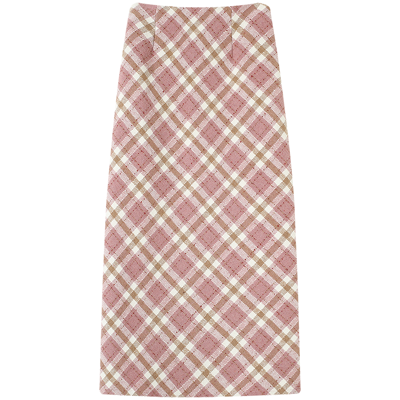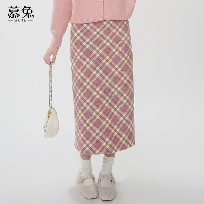 慕兔粉色格子毛呢包臀半身裙女2025新款冬季小个子高腰显瘦a字裙