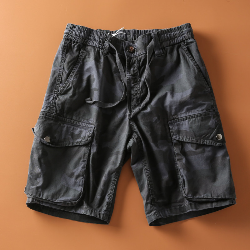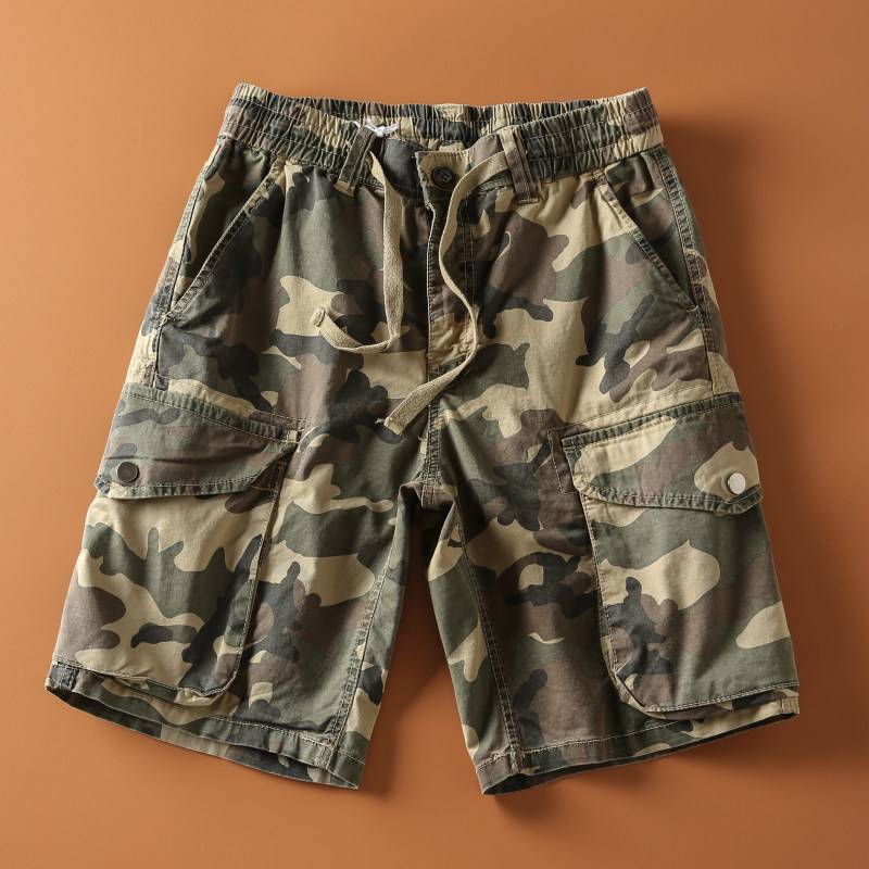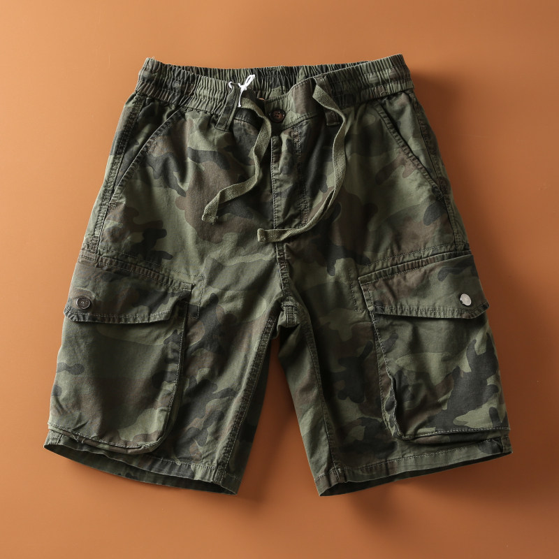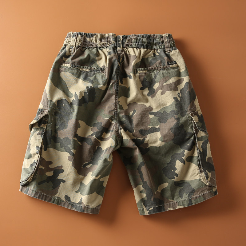 阿美咔叽复古美式水洗做旧迷彩男松紧腰工装口袋直筒短裤五分裤潮