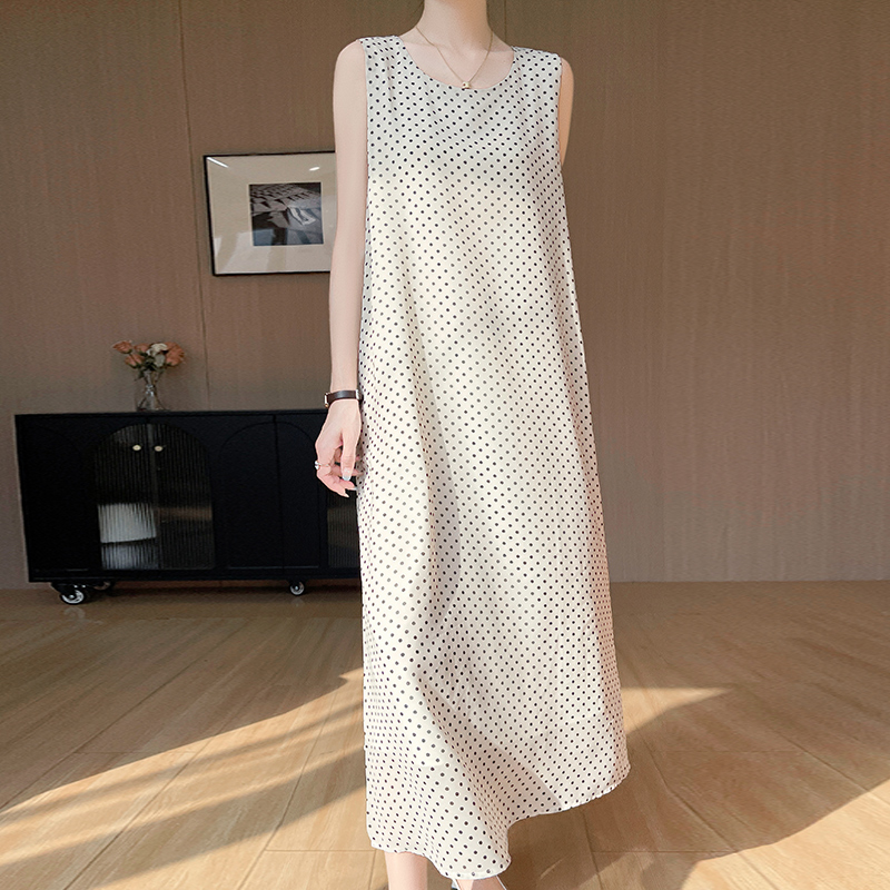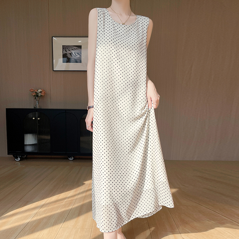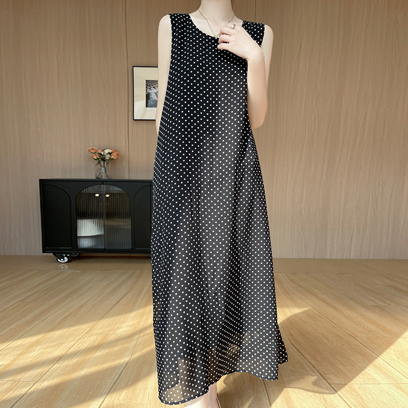 法式优雅圆领宽松波点连衣裙女时尚满天星遮肉减龄夏无袖薄款长裙