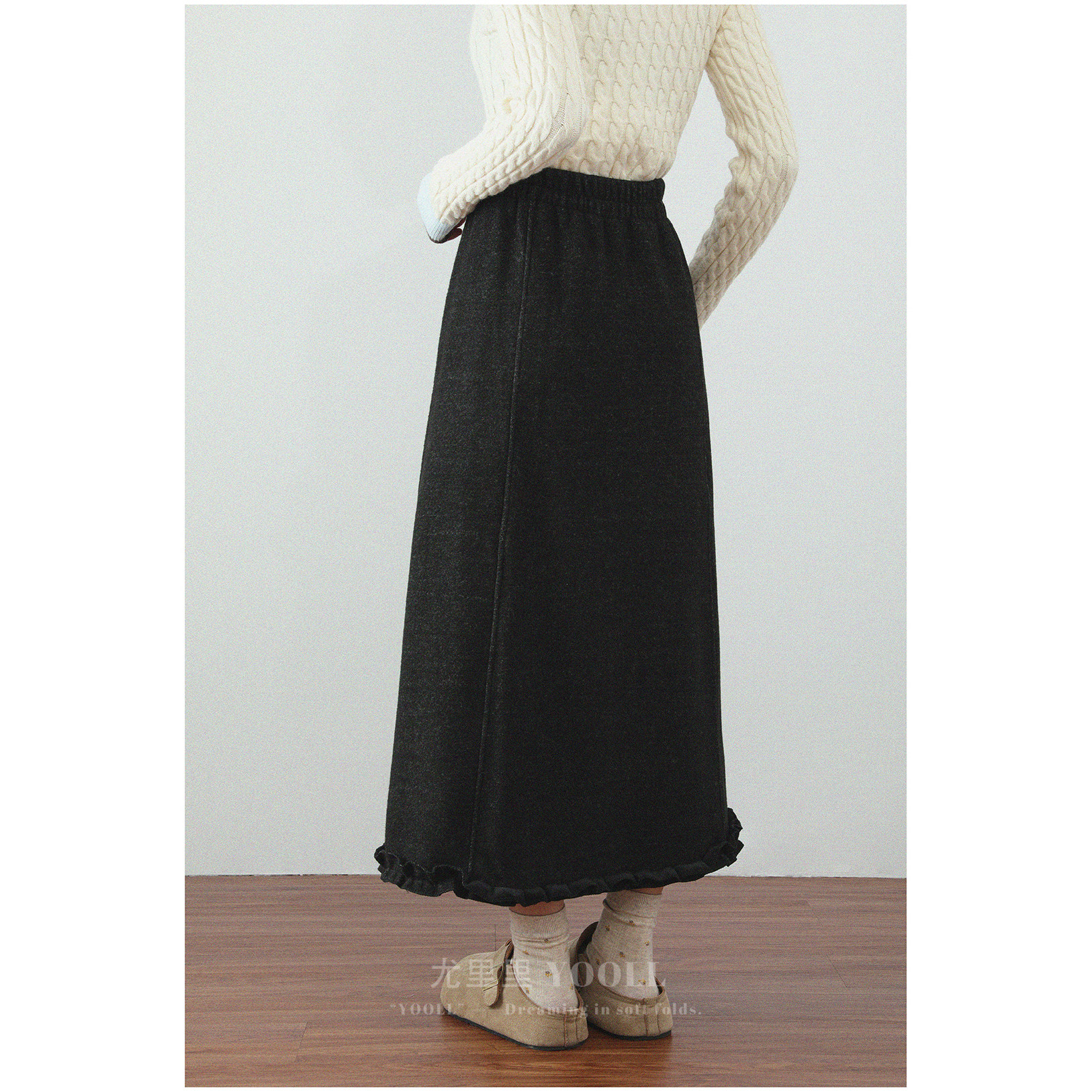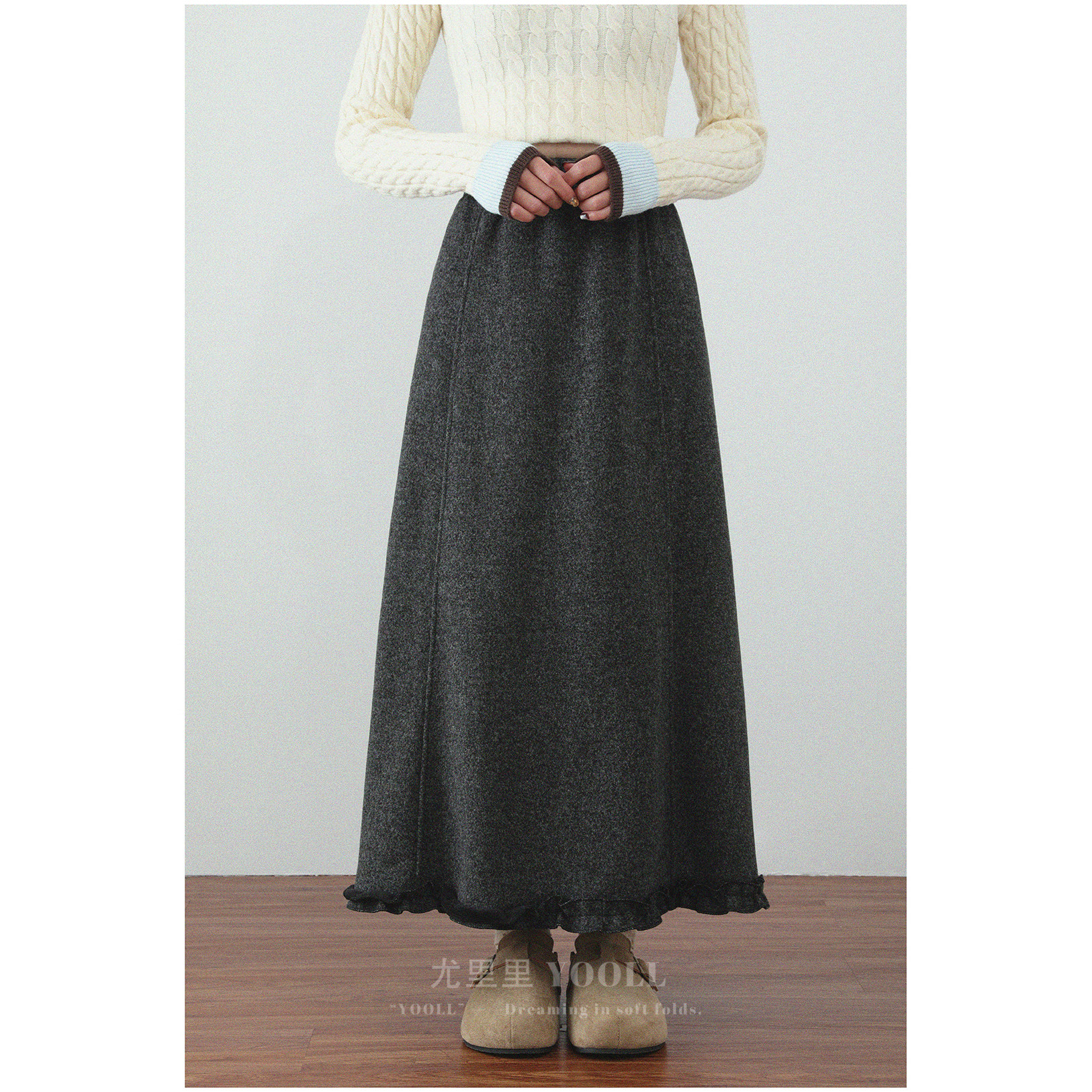 秋冬新款加绒加厚拼接木耳边半身裙女A字高腰显瘦松紧腰毛呢长裙
